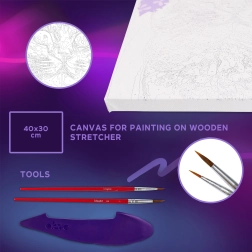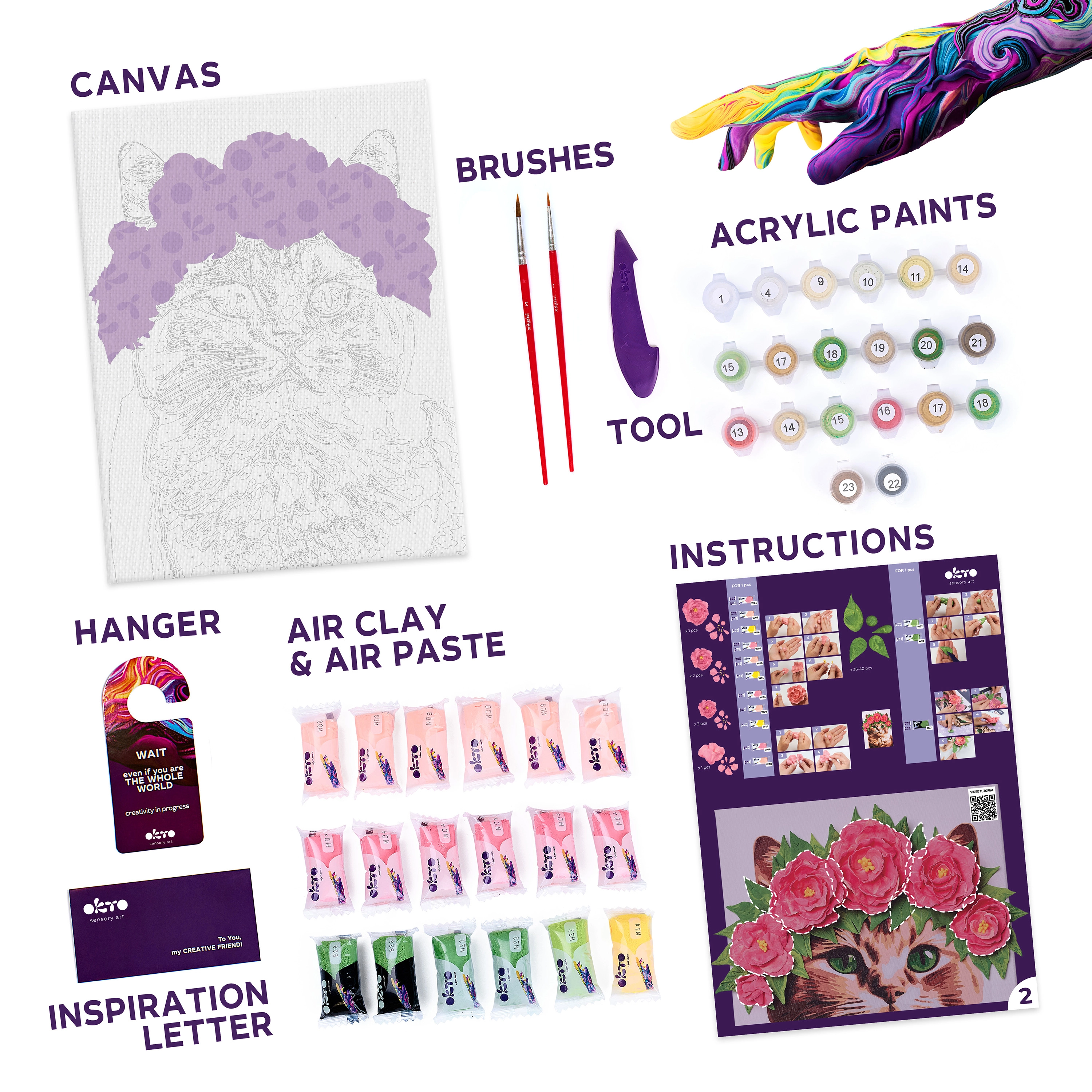- Komplet pakke: lærred, billedvejledning, modelleringsværktøj, selvhærdende modelleringsmasse, farvesæt, pensel.