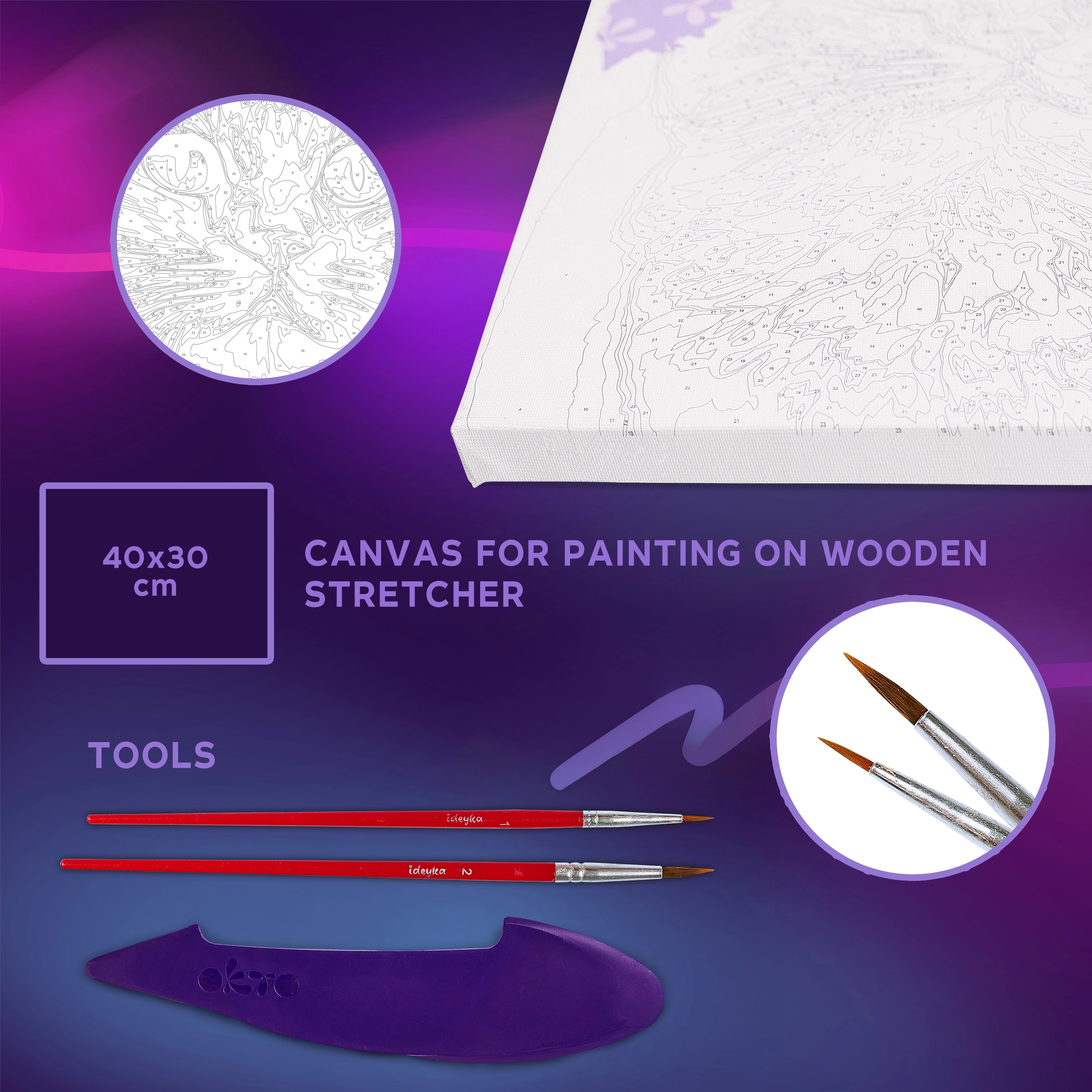 Sættet er komplet – fra lærred over farver til modelleringsværktøj og en overskuelig billedvejledning. Med formatet 30 × 40 cm får du rigelig plads til kreativ udfoldelse og præcis udførelse. Sværhedsgrad 4/5 er et godt valg for let øvede og øvede skabere.