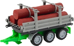 Denne detaljerede traktor med trailer minder troværdigt om ægte skovbrugsteknik. Takket være inertidrift accelererer den hurtigere efter et skub, traileren er tilpasset transport af træstammer, og sættet understøtter fantastisk temaleg på gården og i skoven.