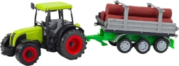 Traktor med trailer og træstammer udgør et komplet sæt. Nem sammenskobling takket være trækkrogen og hjulenes glatte gang.