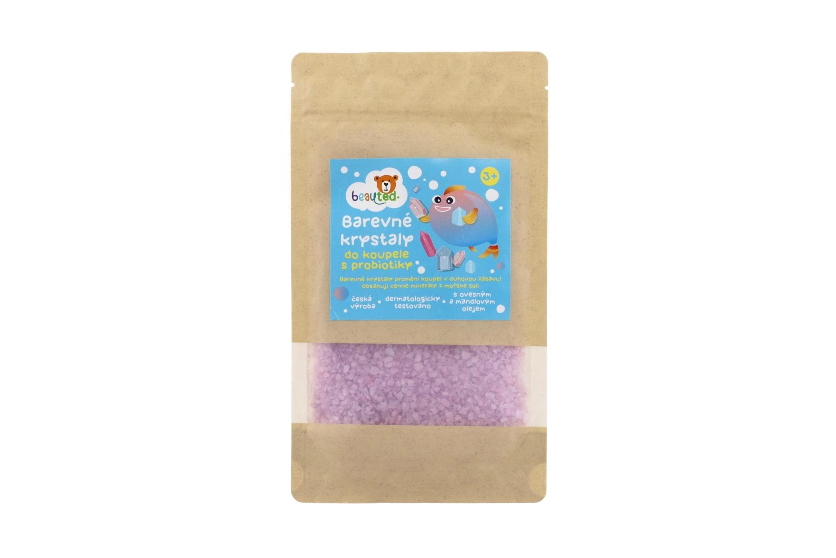 Farvede badekrystaller med probiotika i genlukkelig pose