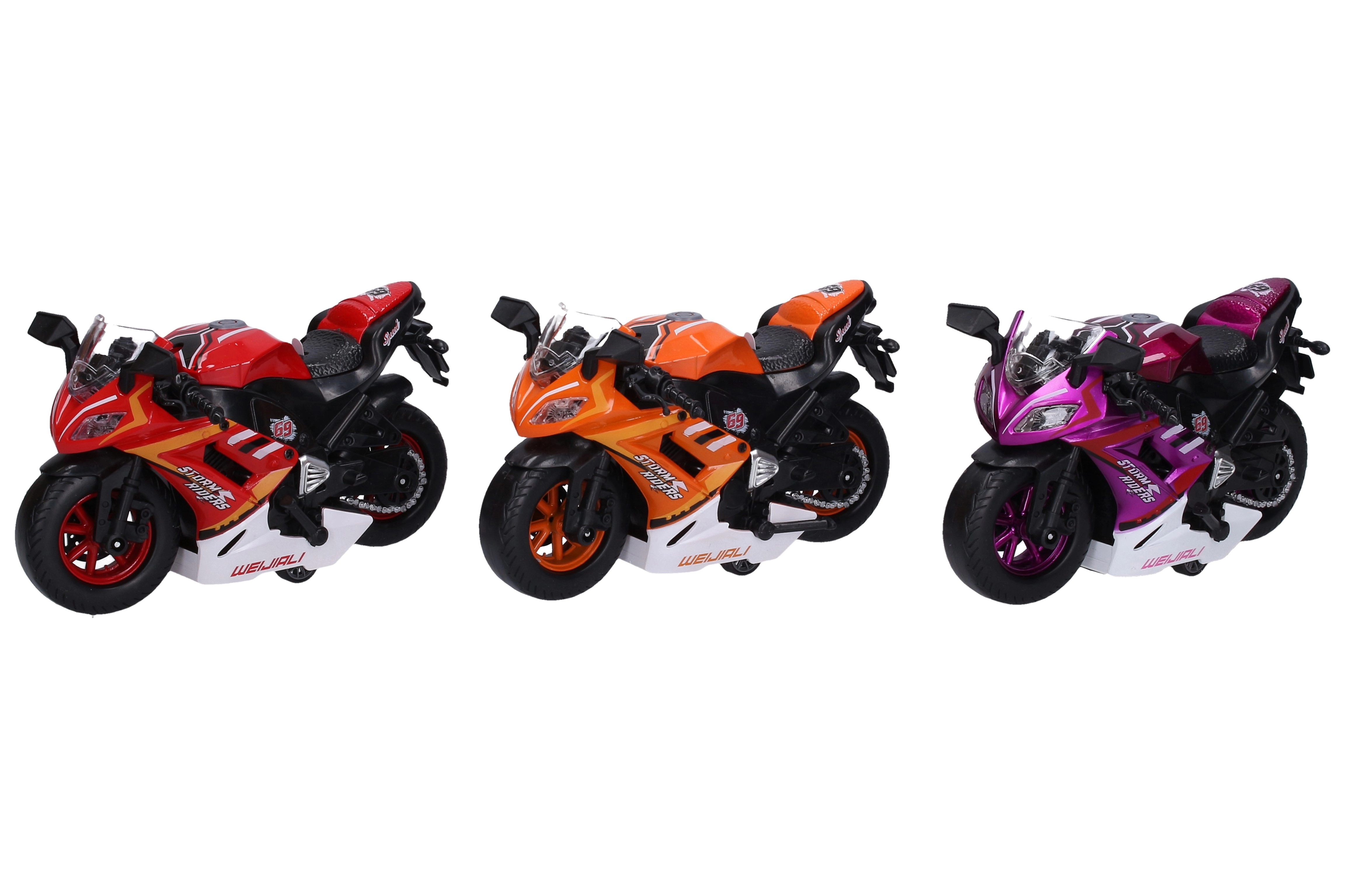 En sjov pullback-motorcykel på 16 cm bringer masser af action til små racerkørere. Den byder på lys- og lydeffekter, fås i flere farvevarianter og er klar til leg med det samme takket være de medfølgende 3× AG3-batterier.