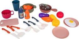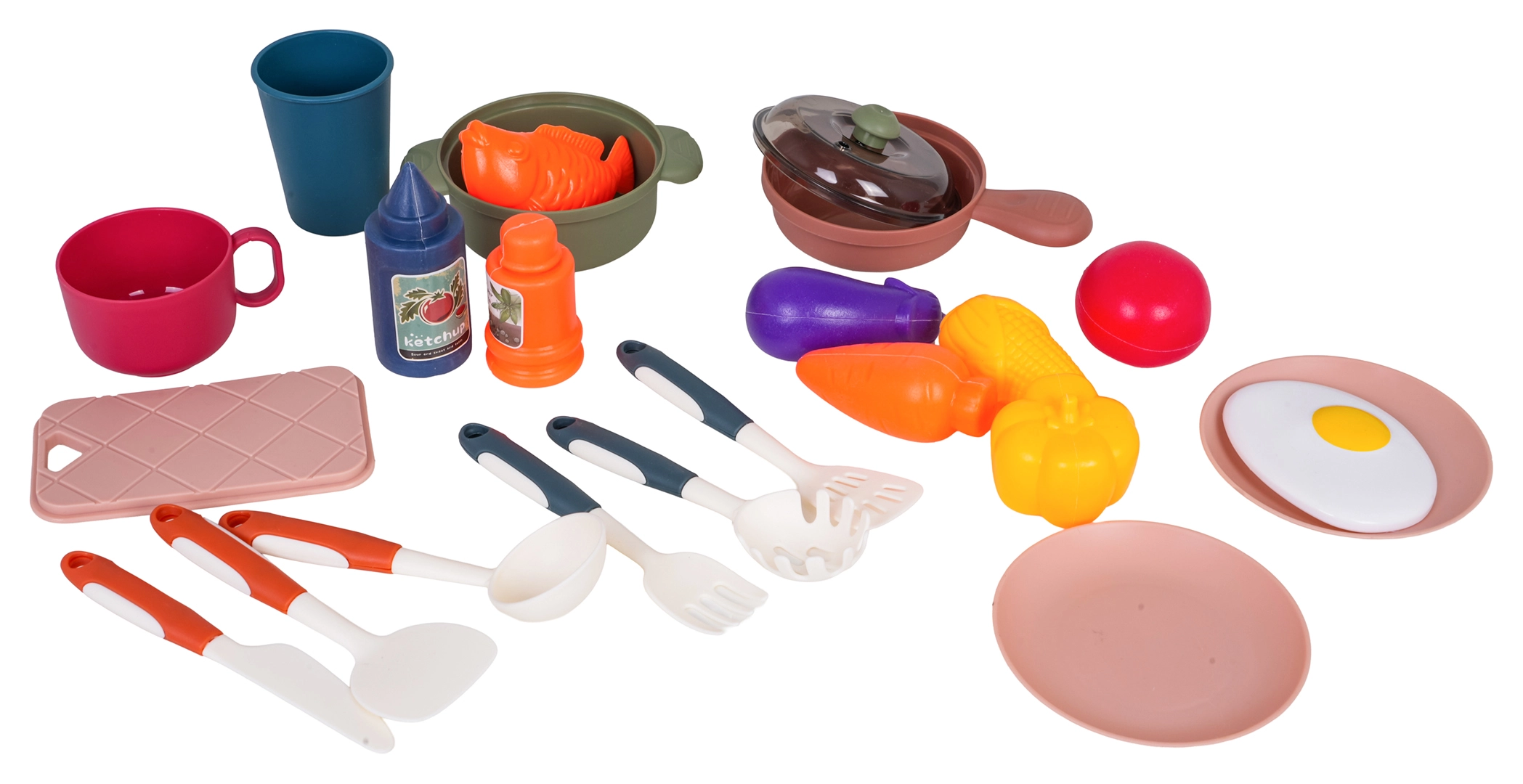 - køkken, pande, gryde med låg, krus, kop med hank, skærebræt, 2 × tallerken, kniv, 2 × vender, øse, pastaske, stor gaffel, ketchup, peber, legetøjsmad: fisk, gul peber, tomat, gulerod, aubergine, majs, spejlæg