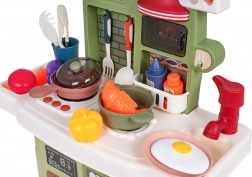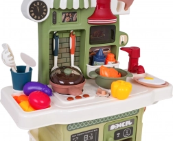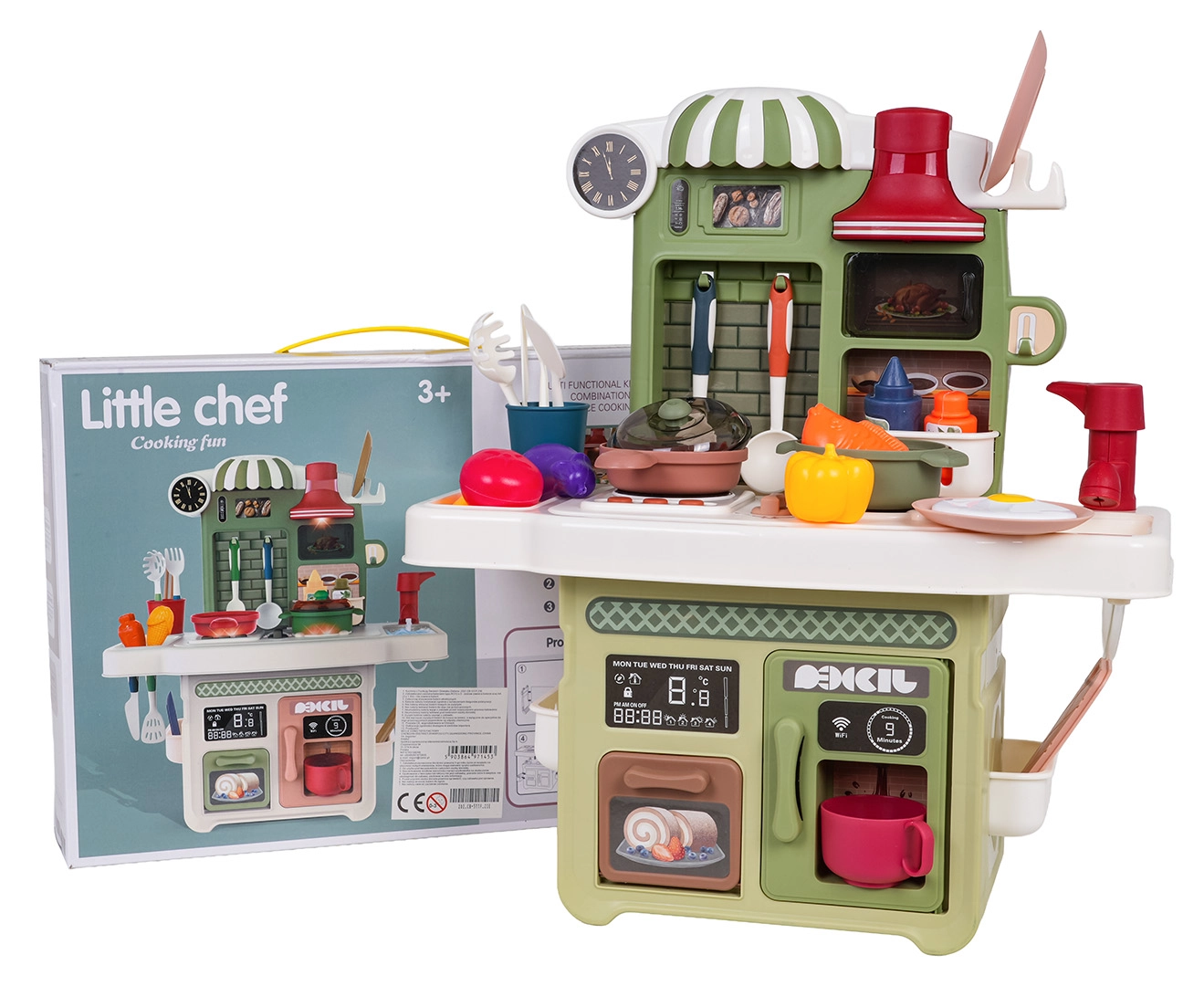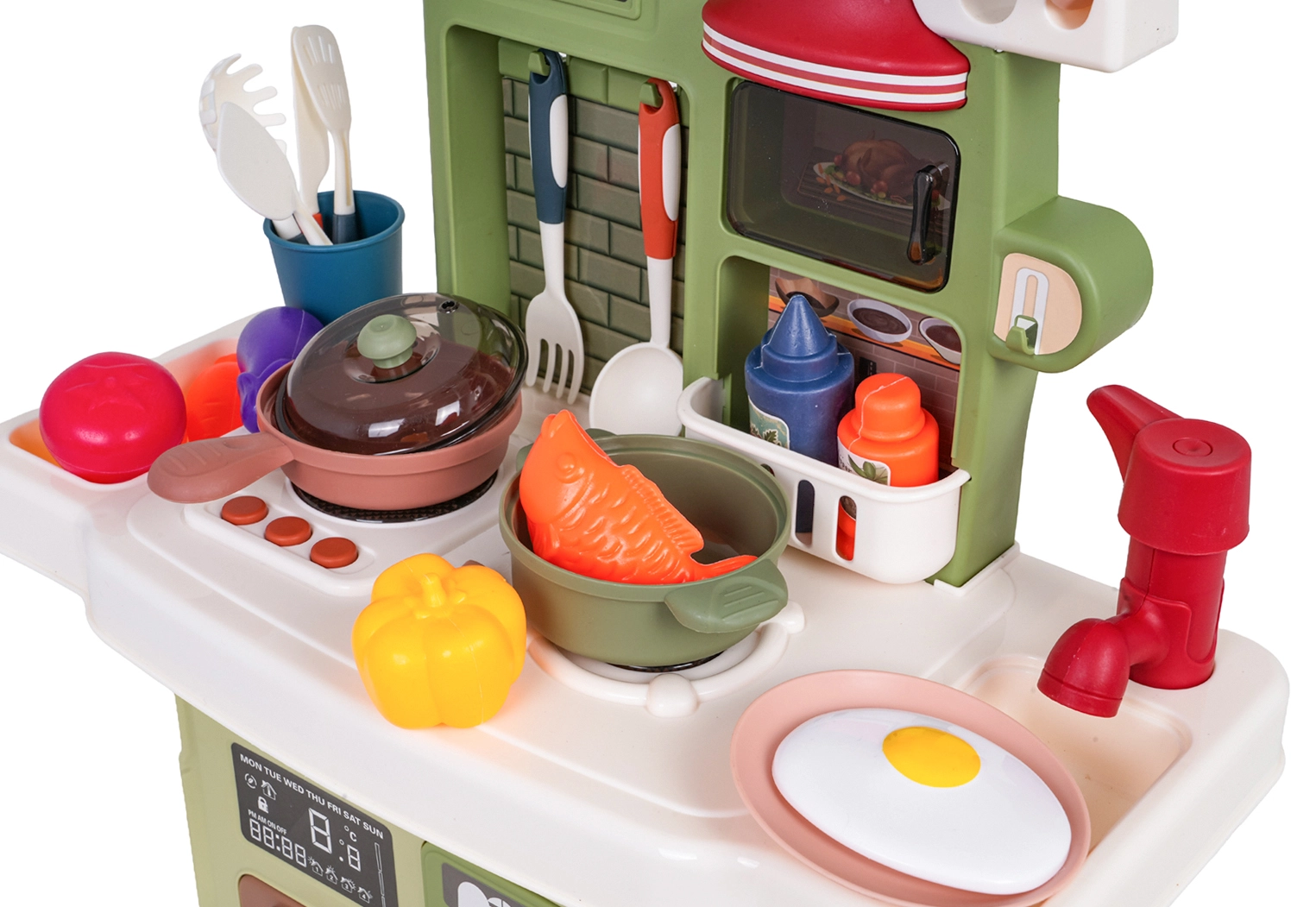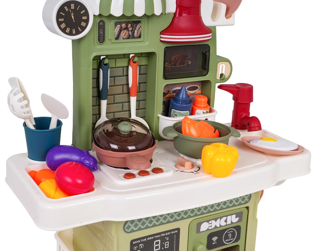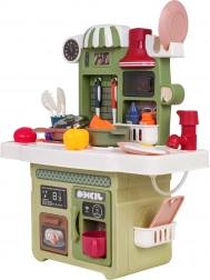 Interaktivt børnekøkken i grøn farve, der giver realistisk leg for små kokke fra 3 år. Det byder på lys- og lydeffekter fra kogepladerne, rindende vand fra pumpe-hanen, åbningsbar ovn og masser af tilbehør. Børn kan nyde lyde af madlavning og stegning, sange og rim samt en oplyst emhætte – alt for sikker og stimulerende rolleleg i køkkenet.