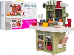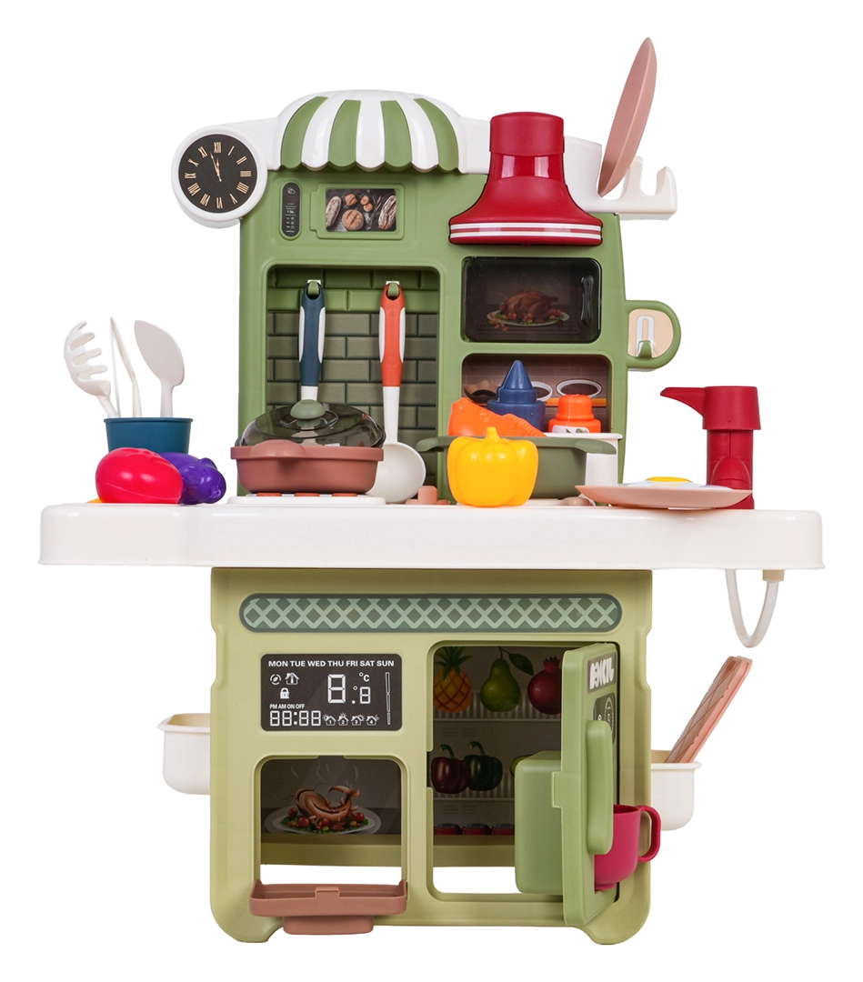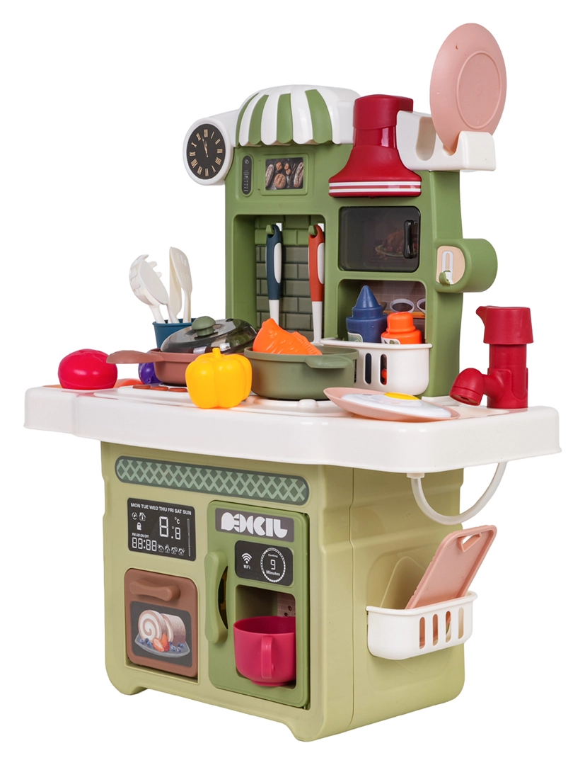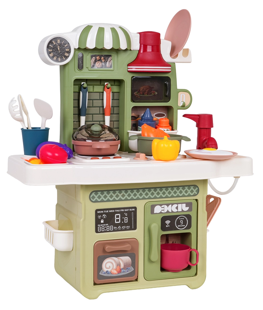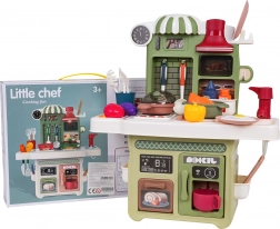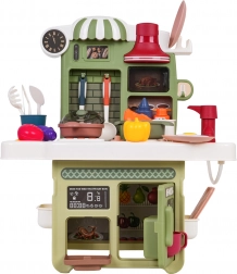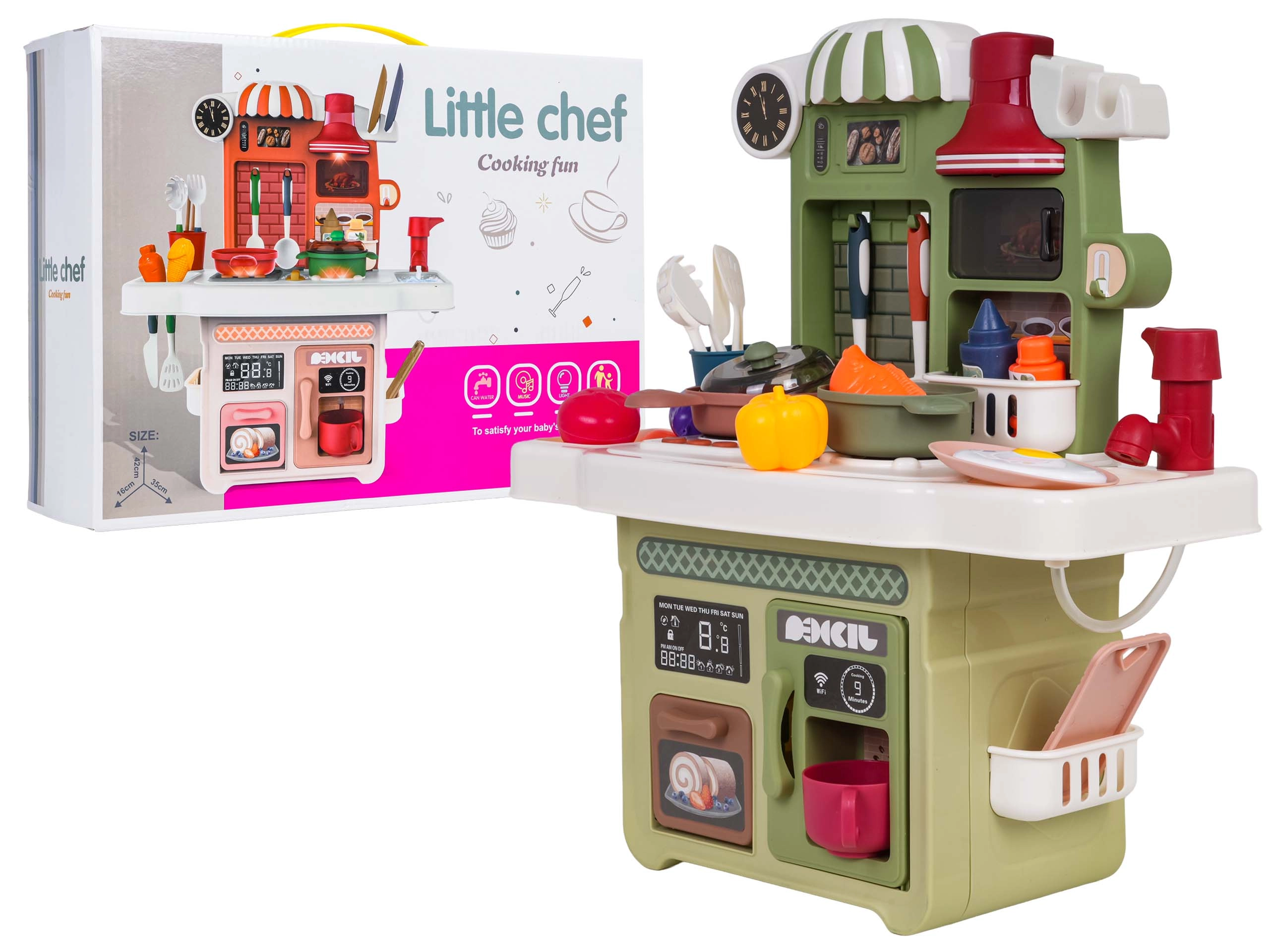 Interaktivt børnekøkken i grøn farve, der giver realistisk leg for små kokke fra 3 år. Det byder på lys- og lydeffekter fra kogepladerne, rindende vand fra pumpe-hanen, åbningsbar ovn og masser af tilbehør. Børn kan nyde lyde af madlavning og stegning, sange og rim samt en oplyst emhætte – alt for sikker og stimulerende rolleleg i køkkenet.