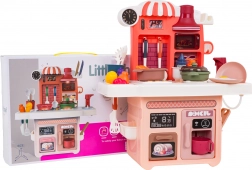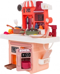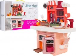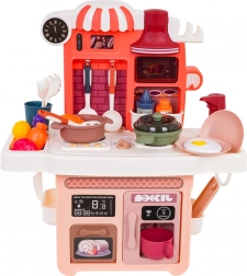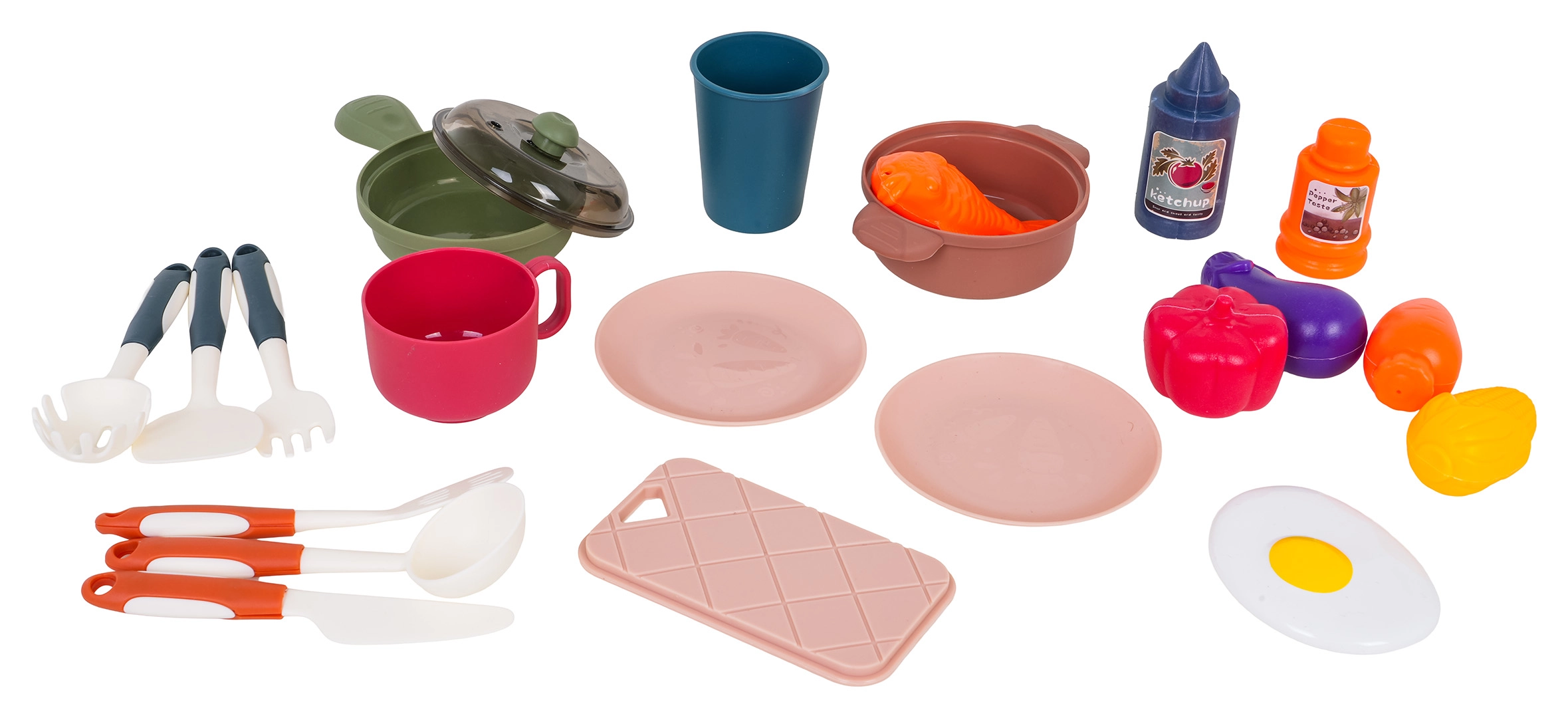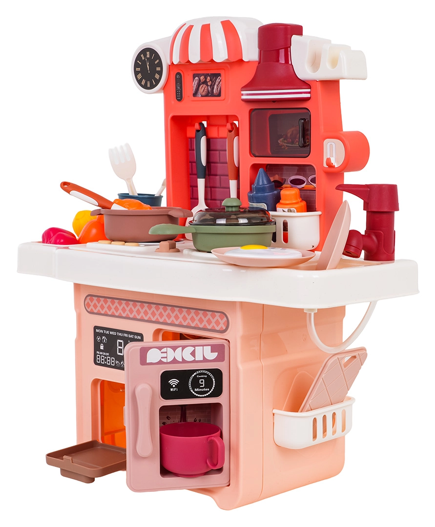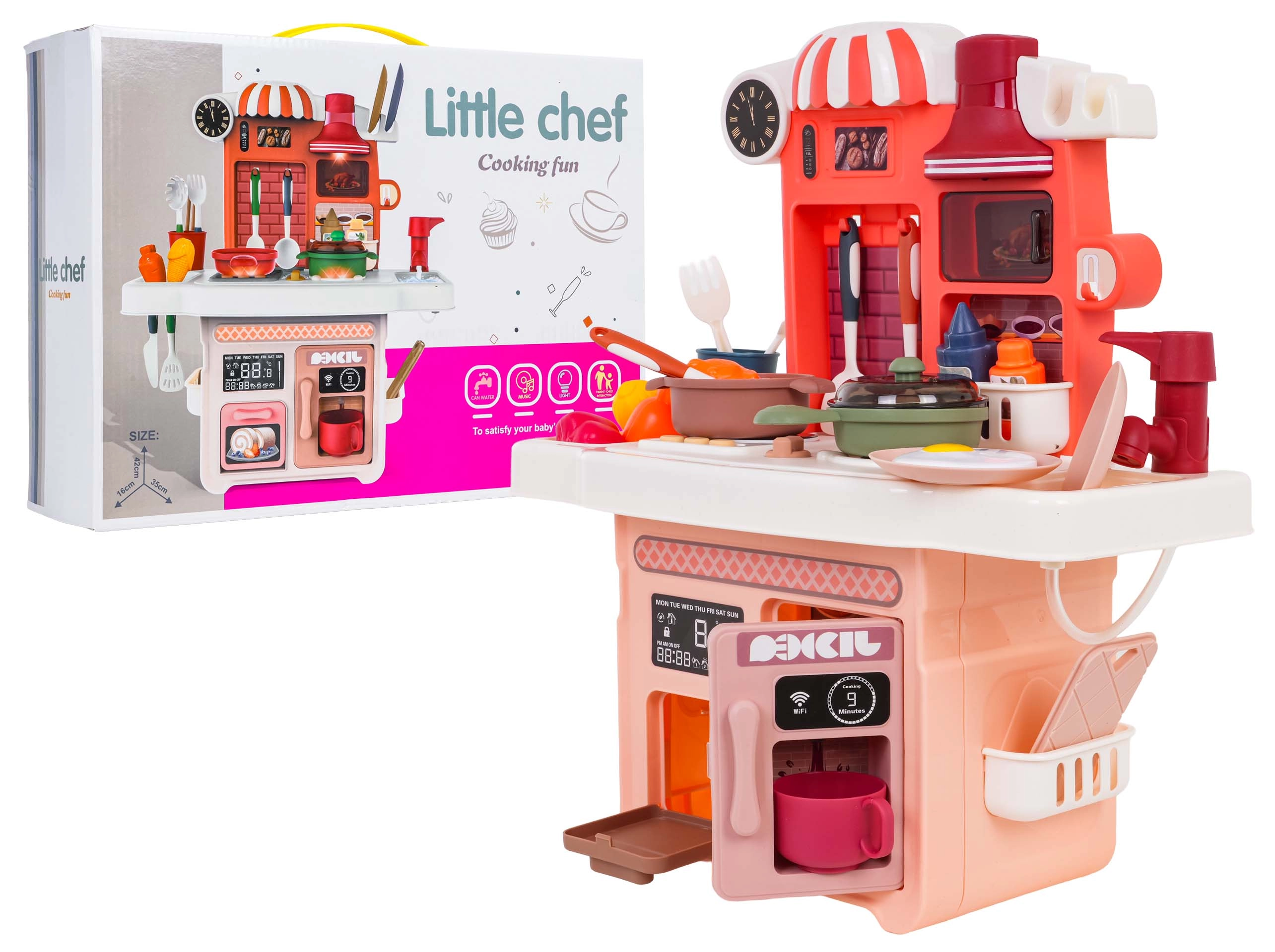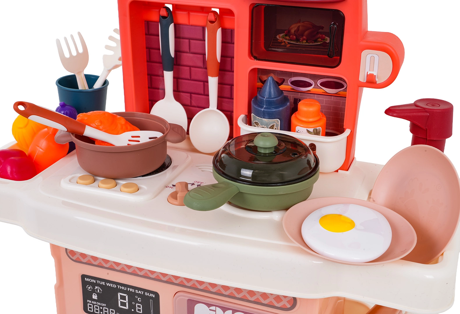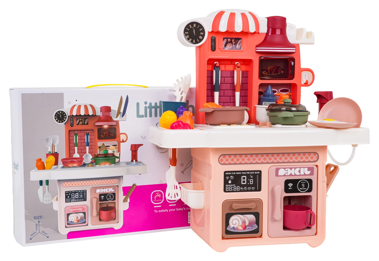 Den store attraktion er den funktionsdygtige vandhane – et batteridrevet pumpeanlæg lader vand løbe i vasken, så børn kan “vaske op” som i et rigtigt køkken. Der er også en åbnbar ovn, imitation af en kaffemaskine og en belyst emhætte. Det rige tilbehør (gryder, pande, redskaber, tallerkener og fødevarer) udvider legemulighederne.