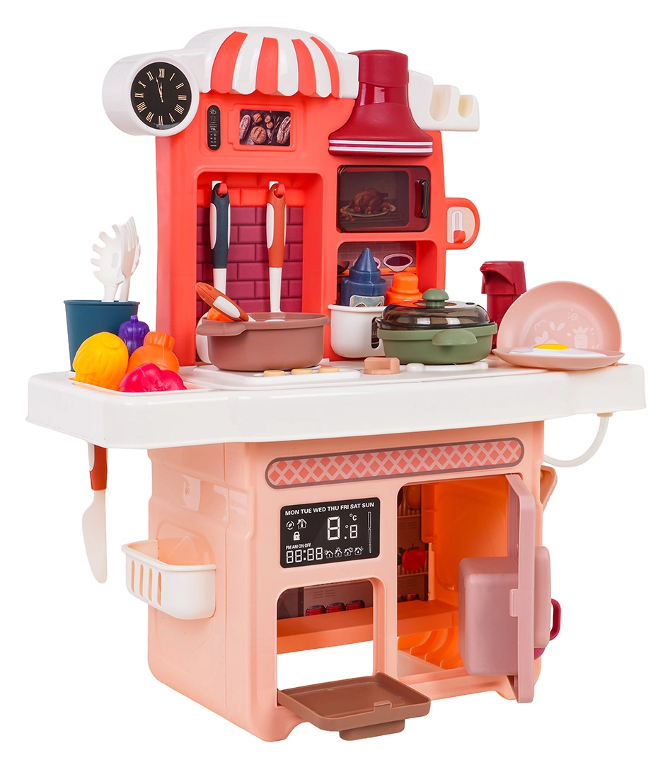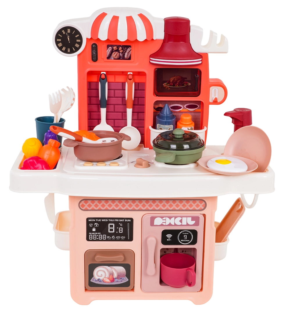 Dette kvalitetsforarbejdede legekøkken i livlige farver understøtter fantasi, rolleleg og finmotorik. Når knapperne drejes, høres autentiske madlavningslyde, og samtidig tændes de oplyste kogezoner. Ved tryk på knapper afspiller køkkenet sange, rim og sikkerhedsanvisninger, som på en sjov måde lærer børn gode vaner.