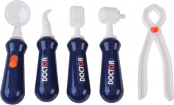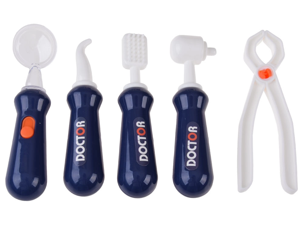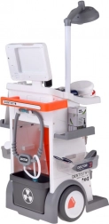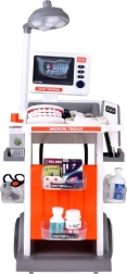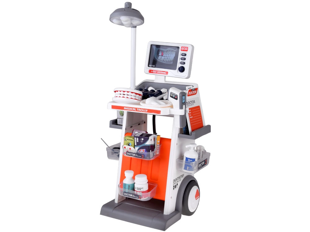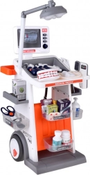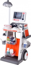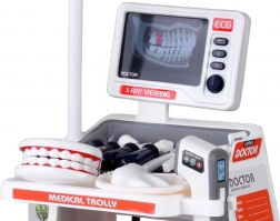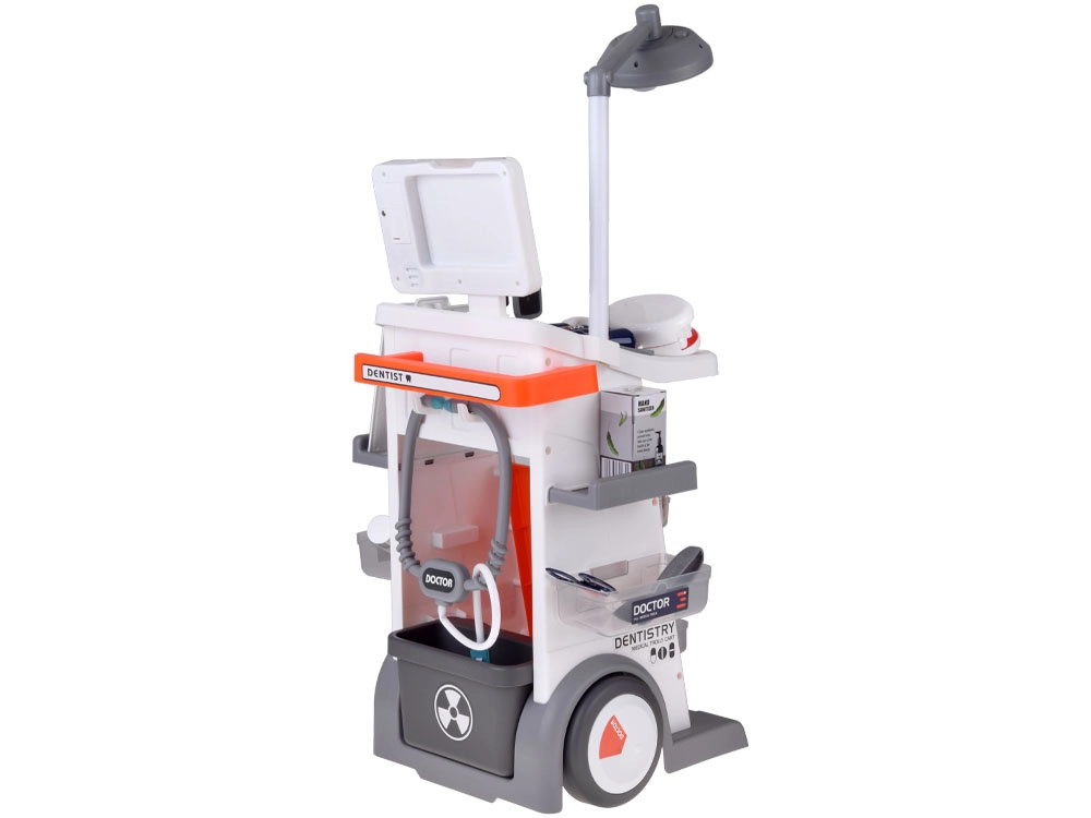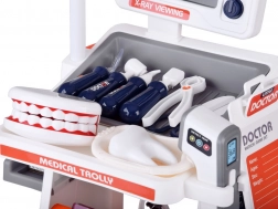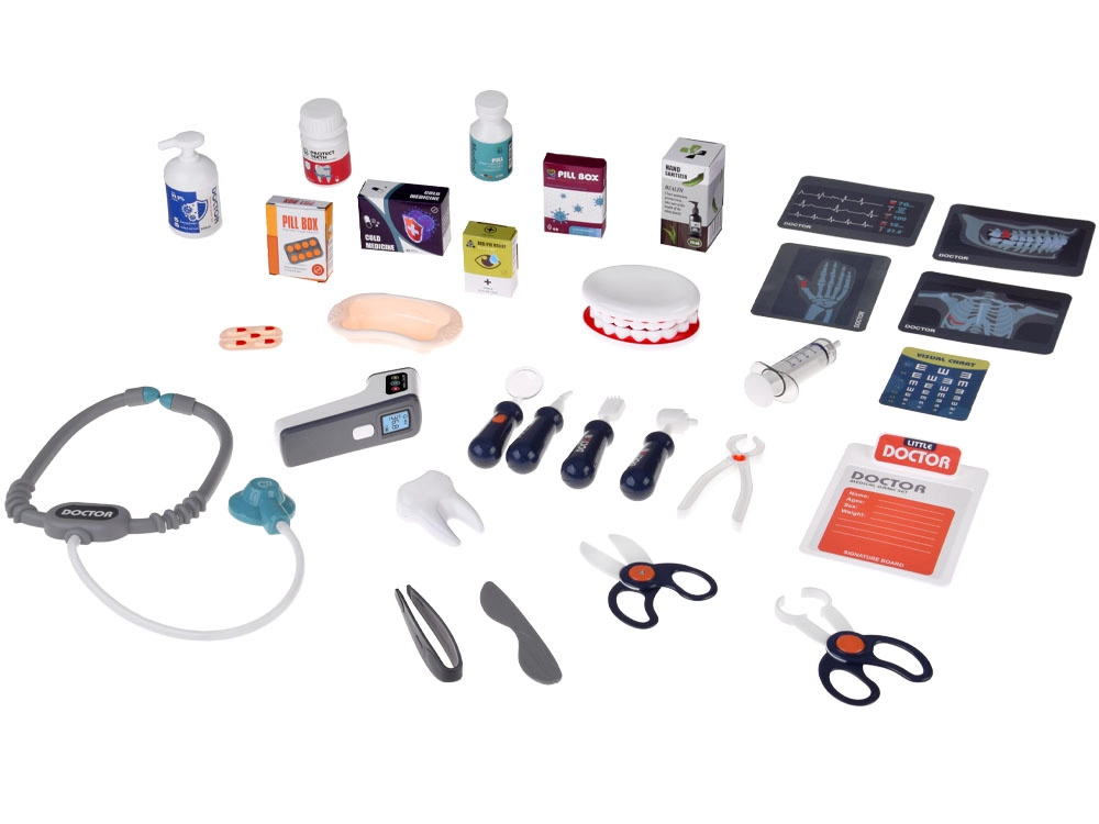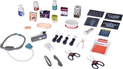 Inkluderer et bredt udvalg af tilbehør: stetoskop, termometer, tandlægespejl med LED, pincet, saks, tandbørste, kapsler, “medicinskasser”, model af åbnbar kæbe samt separat “tand”, EKG-kort og røntgenkort. Takket være den mobile konstruktion og opbevaringshylder er sættet ideelt til delt leg og til at holde orden.
