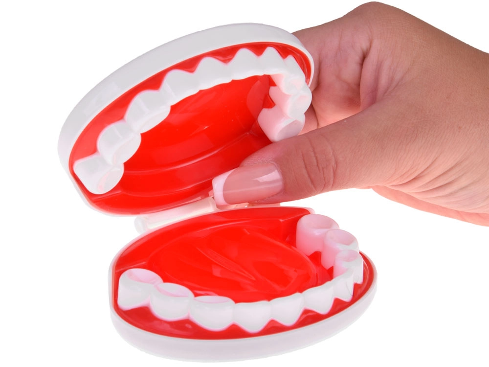 En åbnbar kæbemodel og en separat “tand” lærer korrekte tandplejevaner. Spejl, tandbørste og tandlægeinstrumenter støtter legende læring.