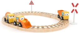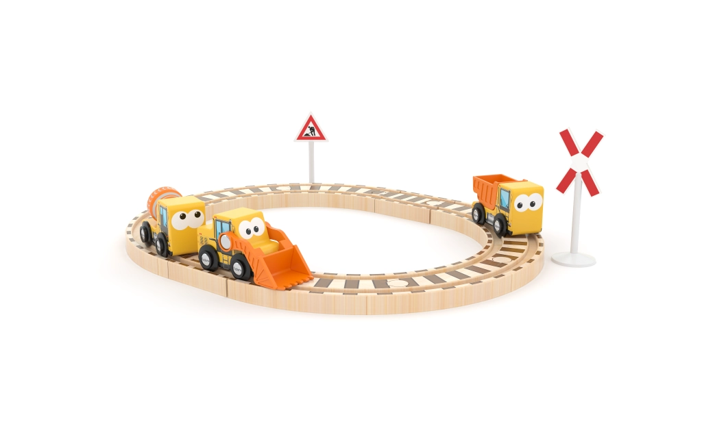 Dette kvalitetslegesæt i træ forener tog- og byggeuniverset i én legeoplevelse. Børn kan samle skinnerne, tage byggemaskiner i brug og skabe deres egne byggefortællinger. Sikre materialer og glat finish giver en behagelig og tryg leg.