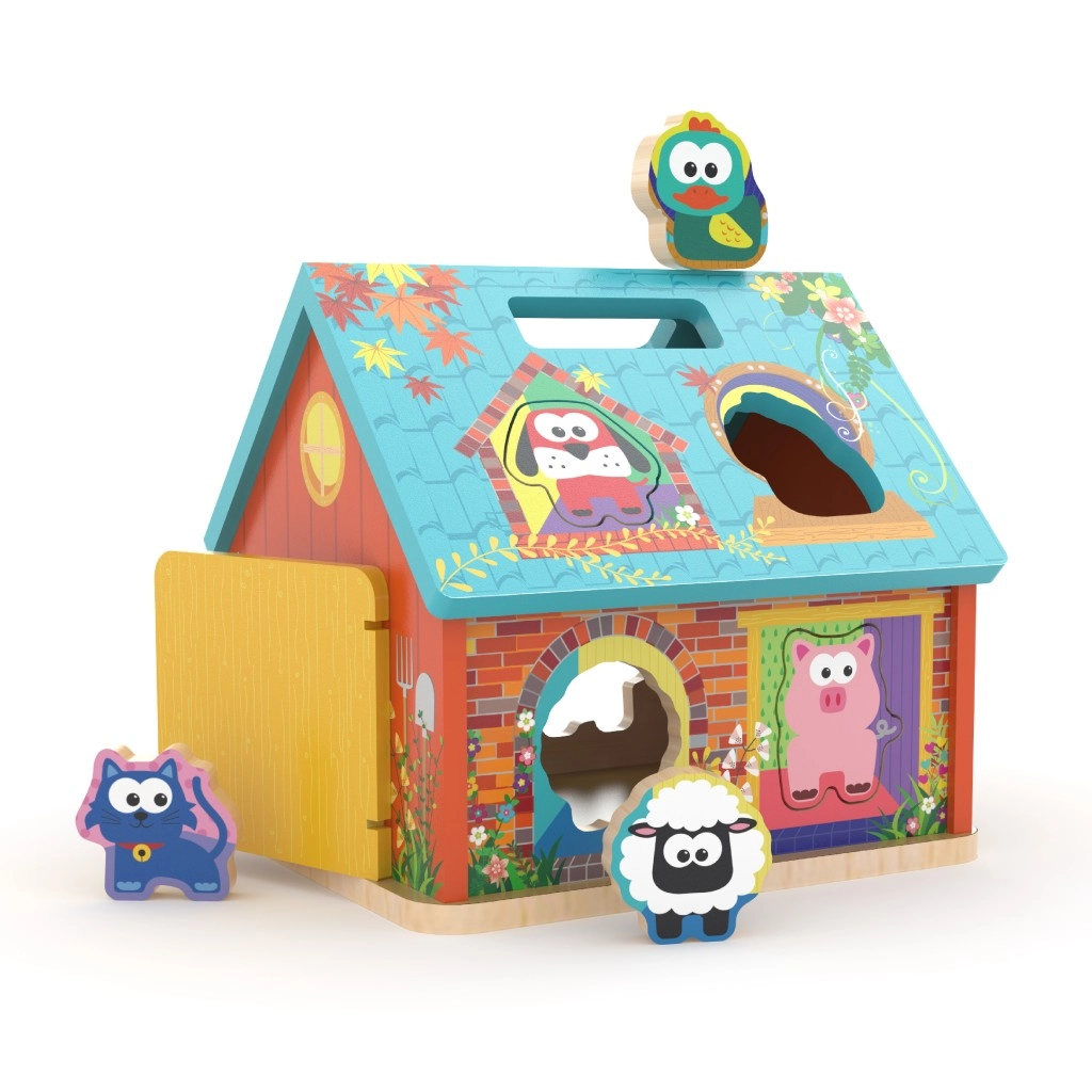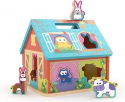 Det træbondegårdshus er et sjovt og lærerigt puttespil, der inviterer børn til at udforske former og dyr gennem leg. Hver trædel har sin plads – det gælder om at lægge den korrekt i det matchende hul i huset. Takket være det praktiske håndtag er legetøjet let at tage med, og børn kan selv klare oprydningen via den åbningsbare dør.