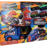 Sjovt sæt til små racerkørere: en trækker, der forvandles til en bane for monstertrucks. Giver timevis af action og kreativitet, understøtter motorik og fantasi. Nemt at transformere, kompakte mål og attraktivt design til børn, der elsker biler og ræs.