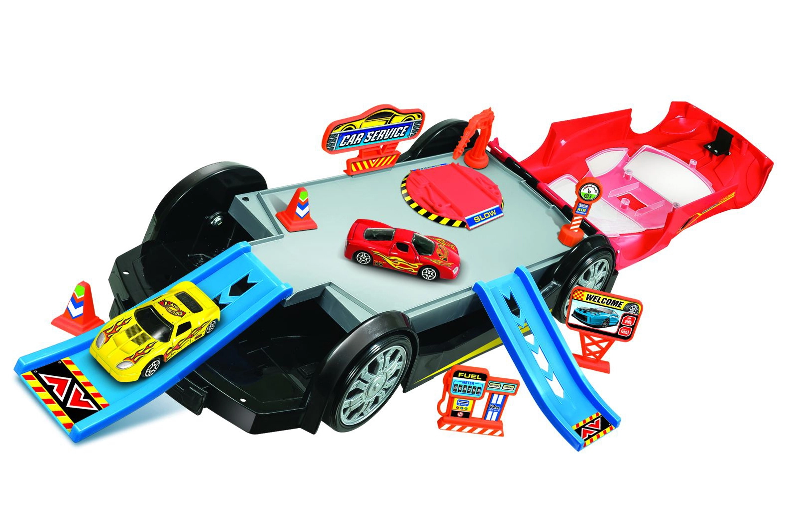 Oplev automekanikernes kreative verden med et sammenklappeligt autoværksted, der ved åbning bliver til en detaljeret service-station. Børn kan parkere, reparere og køre afsted med de medfølgende legebiler. Sættet er ideelt til både selvstændig leg og fælles leg.