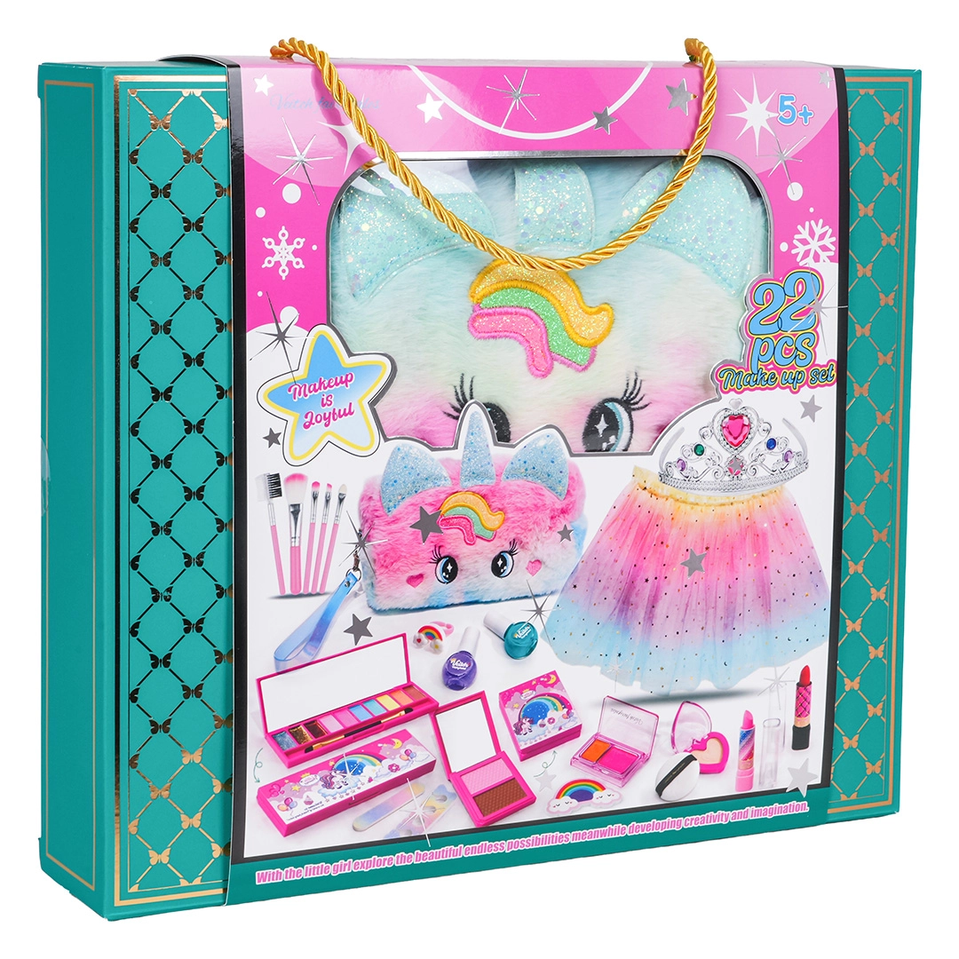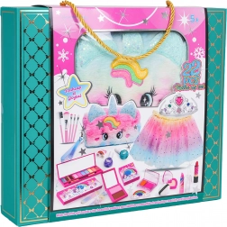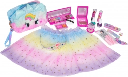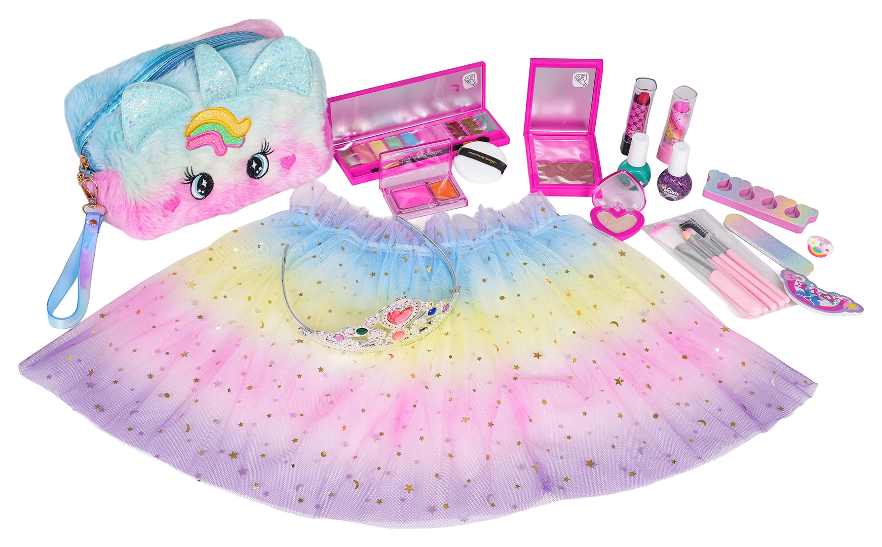 Det komplette sæt til små prinsesser byder på øjenskygge- og glanspaletter, legebenlakker, læbestifter, børster og manicuretilbehør. Med den lette tutu-nederdel med stjerner og den glitrende krone kan børnene let træde ind i fantasiens verden. Alt kan opbevares i den bløde enhjørningetaske, så sættet er perfekt på farten.
