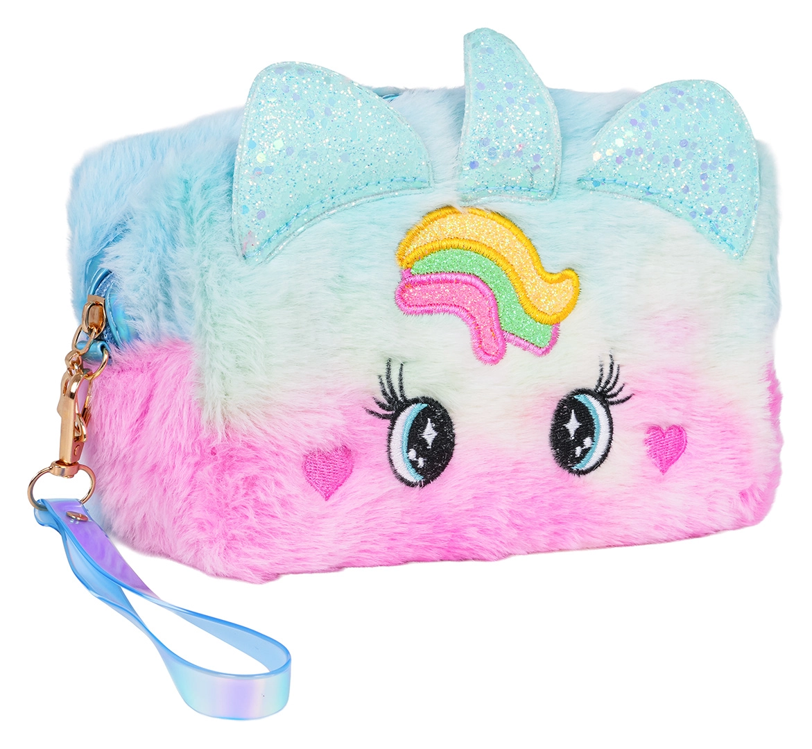 En blød, pelsagtig lille taske med regnbuedetaljer rummer alle tilbehør, og børn vil elske den til at bære småting.