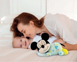 Denne bløde MICKEY MOUSE-plysbamse er den ideelle ledsager til indsovning og rolige stunder i løbet af dagen. Den kombinerer beroligende lyseffekter med melodier og lyde, som efterligner et naturligt miljø for babyen. Det farvede lys med skiftende intensitet (kromoterapi) hjælper med at skabe ro, mindske spændinger og skabe en behagelig atmosfære.