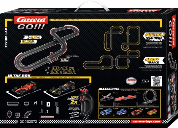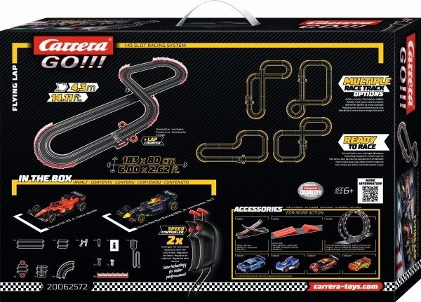 Træd ind i fartens verden med bilbanen Carrera GO!!! Flying Lap. Med mål efter samling på 183 × 80 cm og en smart designet bane med brosektion byder den på dynamiske løb mellem to ikoner fra Formel 1 – FERRARI SF-23 “C. Sainz” og RED BULL RACING RB19 “M. Verstappen”. Det analoge system med mekanisk omgangstæller og controllere med Turbo-funktion giver nervepirrende hjul-til-hjul-dueller.