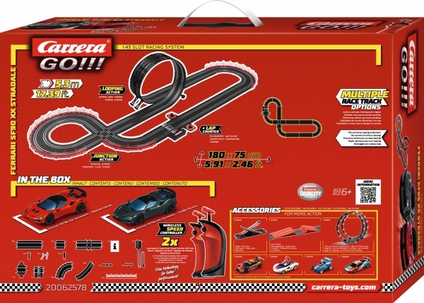 Oplev adrenalinfyldte løb med Carrera GO-racersbanen under FERRARI-licens. Sættet på 5,3 m indeholder to detaljerede biler Ferrari SF-90 XX Stradale, trådløse controllere, looping, kryds og en mekanisk omgangstæller. Nem montering, fremragende vejgreb takket være magneter og dobbelte børster samt Turbo-funktion for maksimal hastighed – ideel underholdning for børn fra 6 år og voksne.