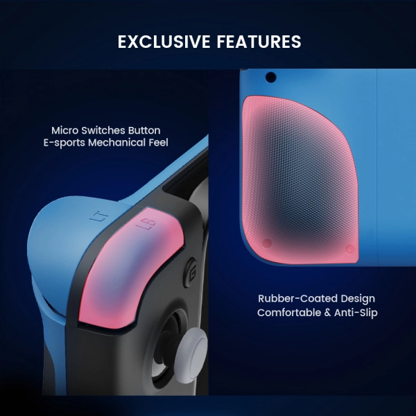 Aktiver Turbo for hurtige handlinger uden forsinkelse, tag skærmbilleder med ét tryk (Android/PC), og brug GameSir-appen (Android) til at finjustere profiler, dødzoner, ombytning af A/B, X/Y samt skift mellem analog og Hair Trigger-tilstand. Gummibelagte, ergonomiske greb og et tofarvet look inspireret af Nintendo 2DS giver både kontrol og stil under lange gaming-sessioner.