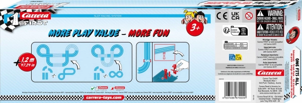 Udvidelsessættet First Track Pack er det ideelle valg til at forbedre CARRERA FIRST baner. Med kombinationen af lige stykker, snævring og kurver med støtter kan du nemt skabe en mere attraktiv bane, der underholder børn i timevis. Installationen er enkel, og kompatibiliteten med FIRST-systemet sikrer problemfri sammensætning af delene.