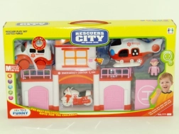 Sættet omfatter tre køretøjer – helikopter, bil og motorcykel – alle udstyret med lys- og lydsignaler, samt en redder-figur og et hospitalskilt. Det holdbare plastdesign i attraktive farver sikrer lang levetid og visuelt appel. Legen understøtter sociale færdigheder, fantasi samt hånd-øje-koordination.