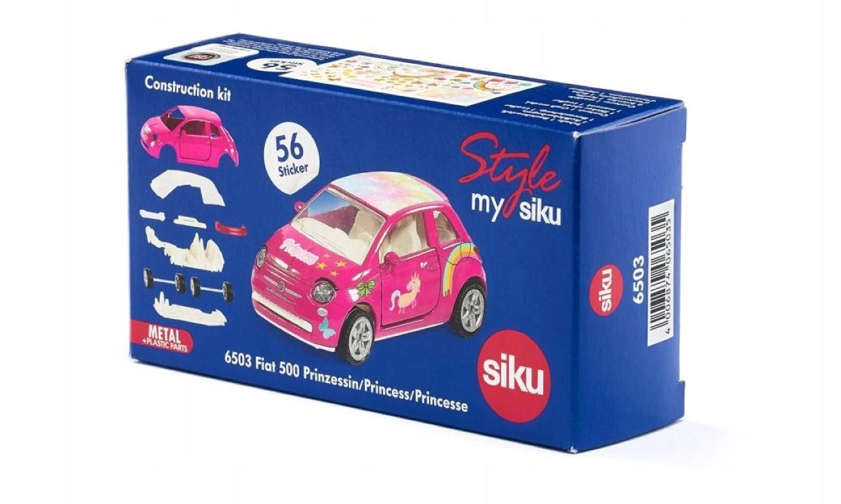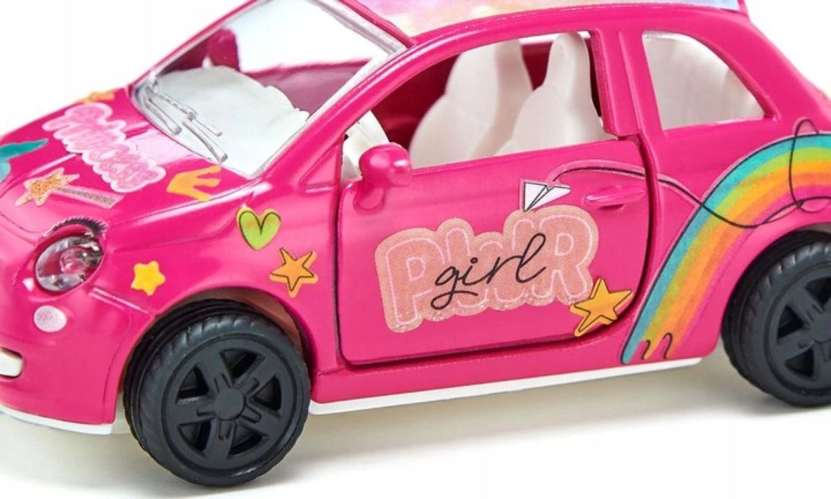 Den pink FIAT 500 i Princess-udgaven fra Siku er et fremragende valg for små designere og alle bilentusiaster. Modellen leveres som et sjovt byggesæt, så børn først kan samle bilen og derefter dekorere den med de medfølgende klistermærker med regnbuer, stjerner og enhjørninger. Takket være kombinationen af metal og plast er modellen solid, holdbar og klar til daglig leg.