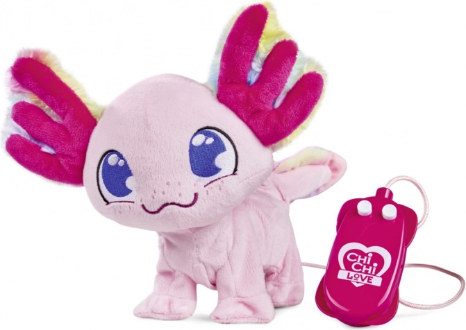 Oplev en magisk verden med den interaktive axolotl CHI CHI LOVE. Dette 20 cm høje plysdyr i blid lyserød med regnbuefarvede ydre gæller og store broderede øjne charmerer ved første øjekast. Betjeningen via den kabeltilsluttede fjernbetjening fungerer også som en line, så axolotlen let kan føres og reagerer med bevægelser og lyde.