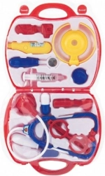 Stetoskop, termometer, sprøjte og andre farverige redskaber inspirerer til realistisk og sjov leg, der udvikler fantasi og kommunikation.