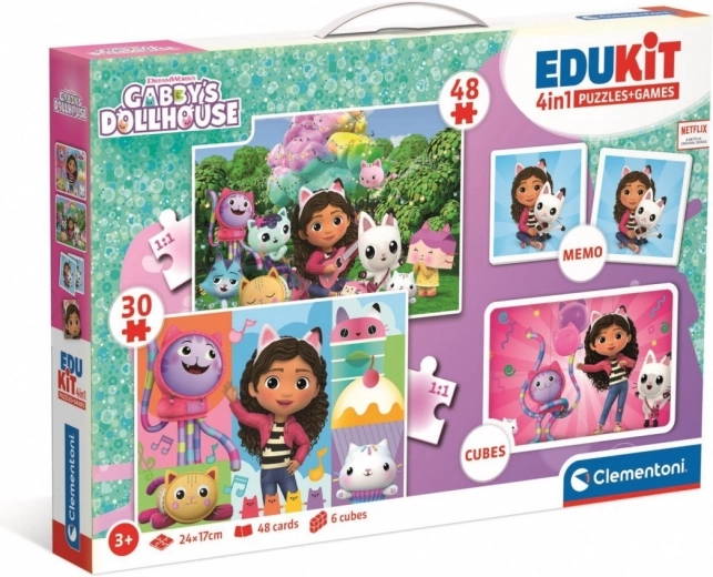 Læringssættet EduKit 4 i 1 GABIs kattehus samler fire populære aktiviteter i én æske. Børn kan lægge to puslespil med 30 og 48 brikker, træne hukommelsen med memokort og bygge med 6 klodser. Med motiver fra den populære serie er hver aktivitet sjov, farverig og motiverende.