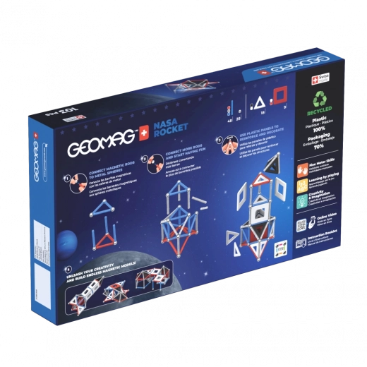 Denne limited edition af det magnetiske byggesæt GEOMAG er udviklet i samarbejde med NASA og begejstrer både små og store rumentusiaster. Takket være stærke magneter, lette rammer og metalforbindelser kan du nemt samle en raket, et lunar modul og fantasifulde konstruktioner. De holdbare dele og smarte forbindelser giver stabile modeller og leg uden besvær.