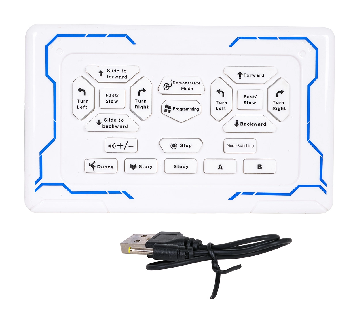 - robot, fjernbetjening, USB-opladningskabel, manual