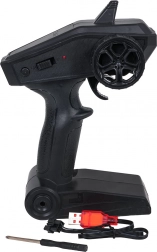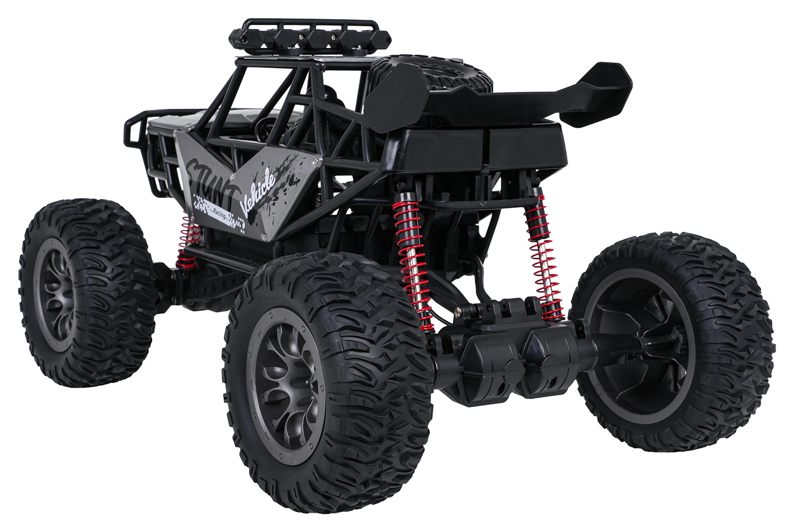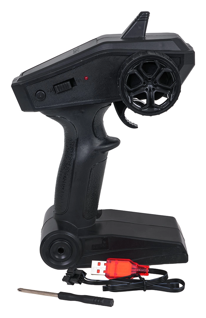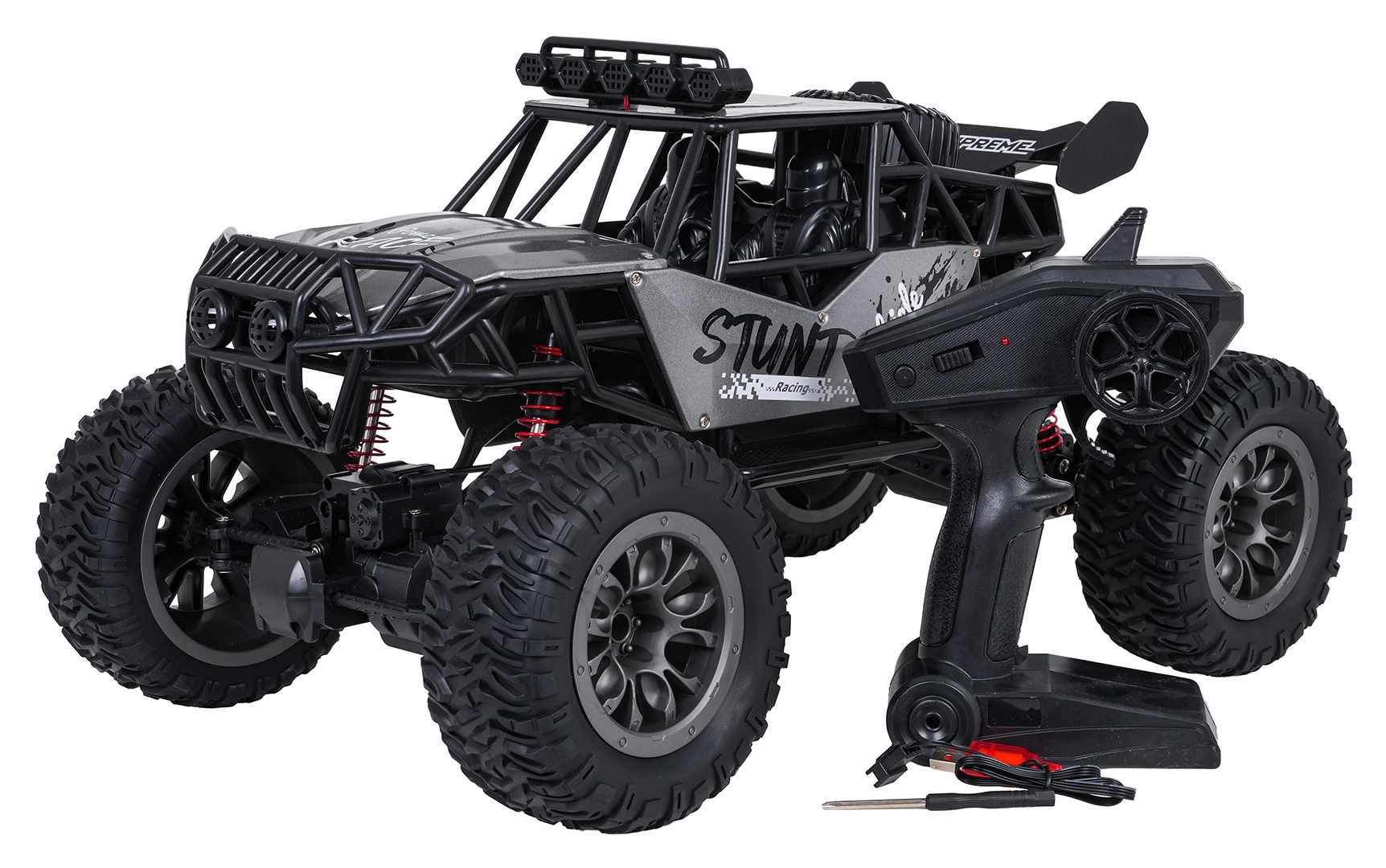 Takket være firehjulstræk 4x4, høj frihøjde og uafhængig fjederophængning klatrer modellen let over forhindringer og klarer stunts. Forlygter og LED-panel på taget forbedrer synligheden og giver et attraktivt look. Praktisk strøm via 7,4 V batteri (inkluderet) sparer på løse batterier, controlleren kræver 4× AA (medfølger ikke).