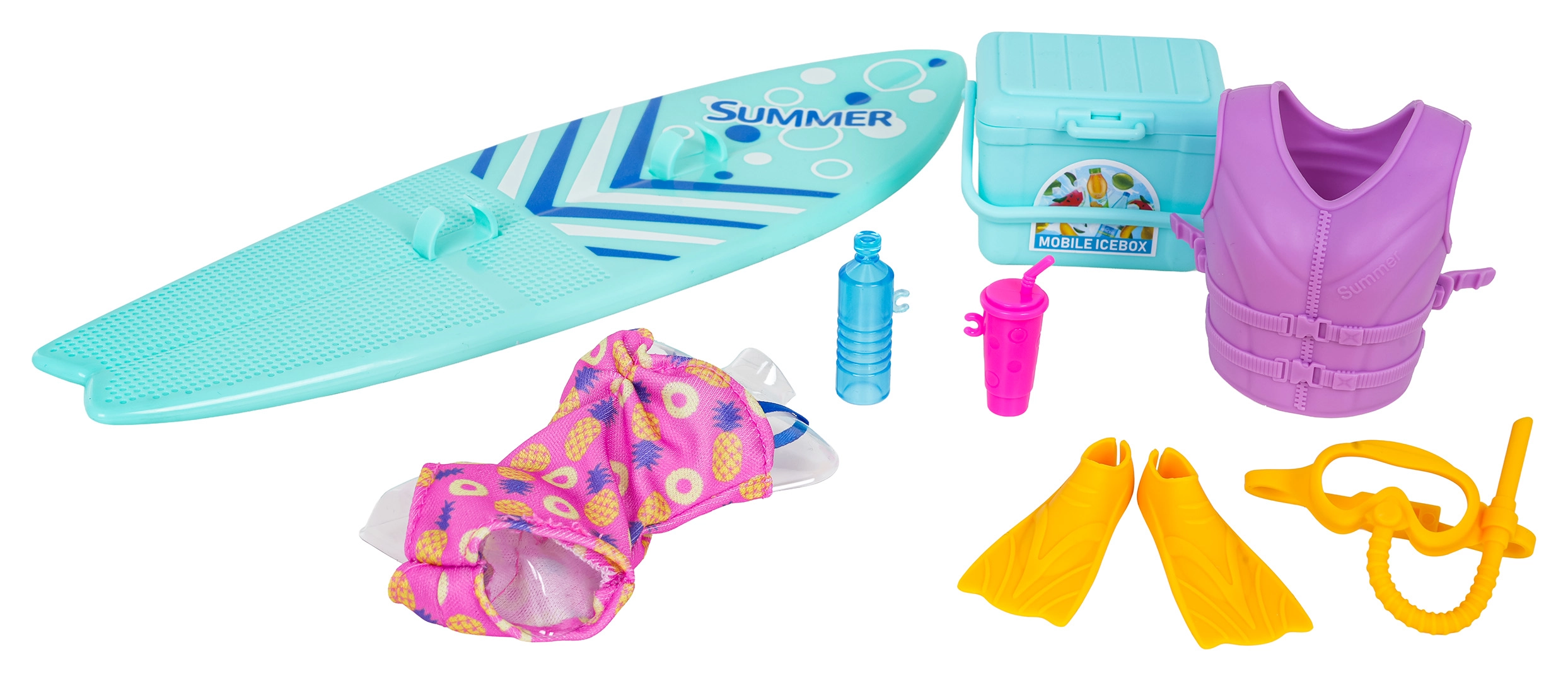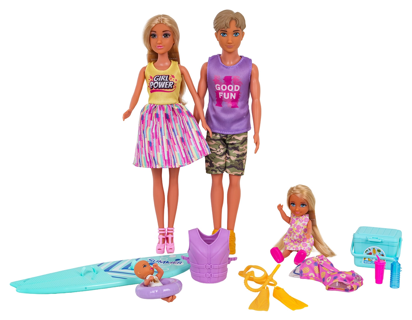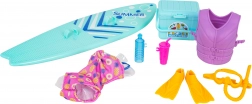 - 4 dukker (mor, far, datter, baby), surfbræt, redningsvest, svømmefødder, maske/ilt-sæt, badetøj, køletaske, 2 drikkeflasker/krus, badering