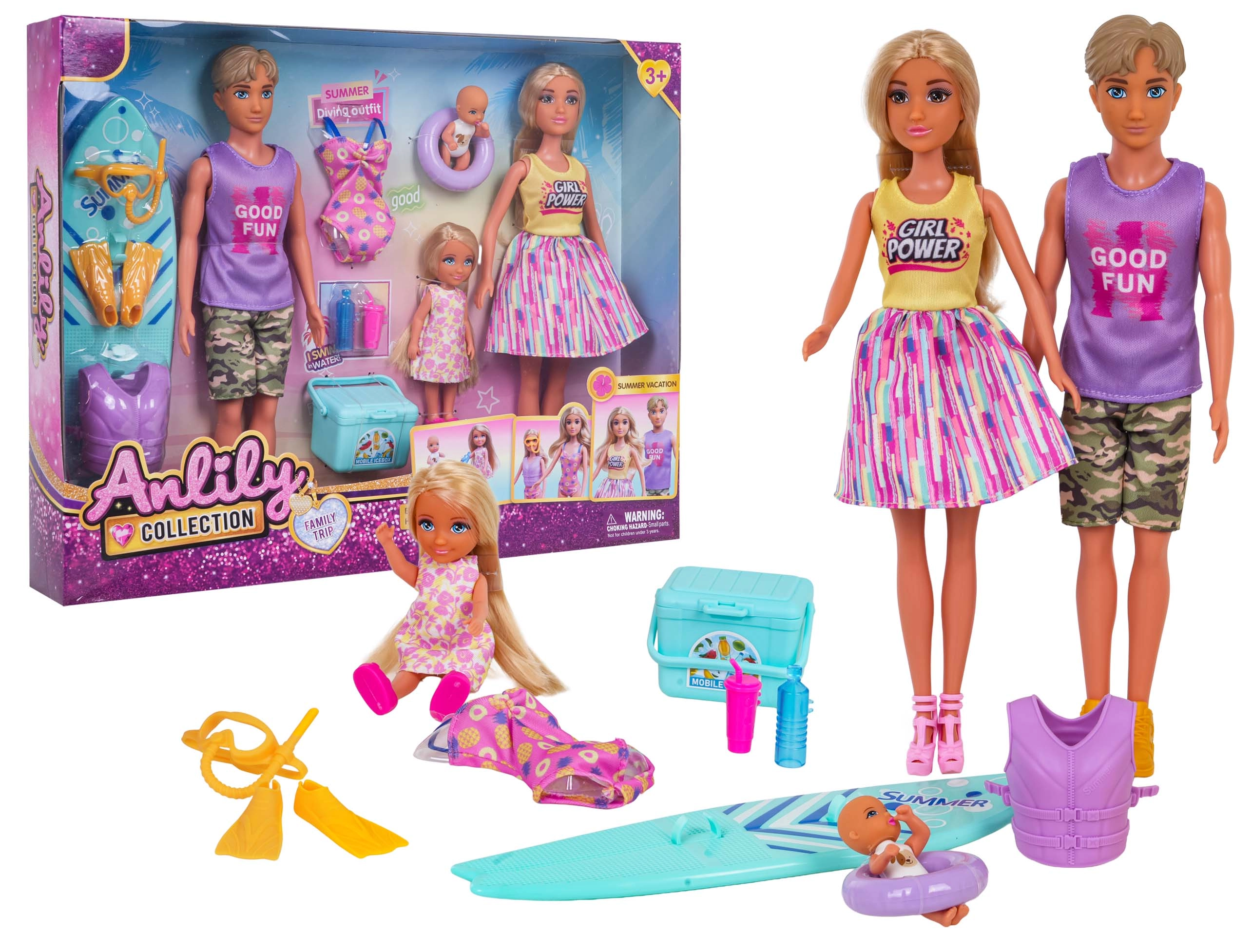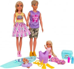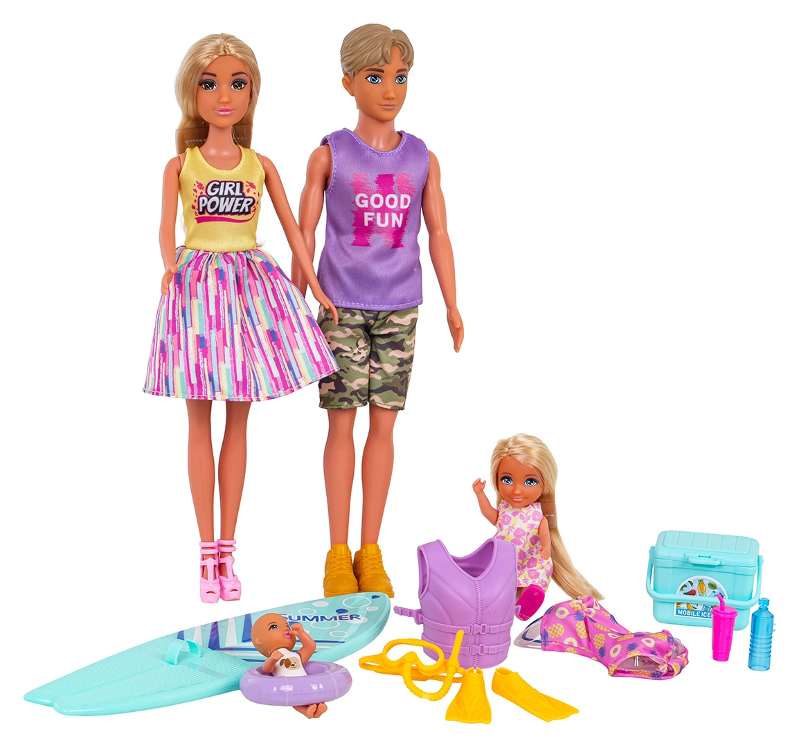 Nyd sommerens eventyr med dette familie-strandsæt – mor, far, datter og baby samt masser af tilbehør til surfing og badning. Sættet indeholder blandt andet surfbræt, redningsvest, svømmefødder, badering og køletaske til drikkevarer. Dukkerne har bevægelige lemmer og er nemme at klæde om, så sættet er ideelt til kreativ rolleleg, at stimulere fantasien og timevis af sjov.
