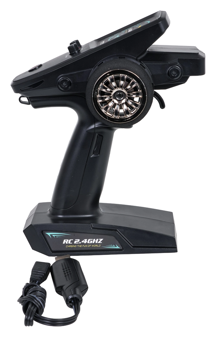 I pakken finder du: 2,4 GHz sender, 7,4 V batteri (inkluderet), USB-opladningskabel, reservehjul, sæt nøgler og karrosseriklips, manual. Senderen drives af 3× AA 1,5 V.