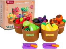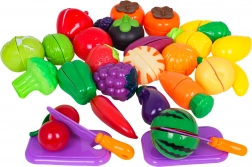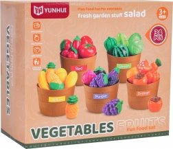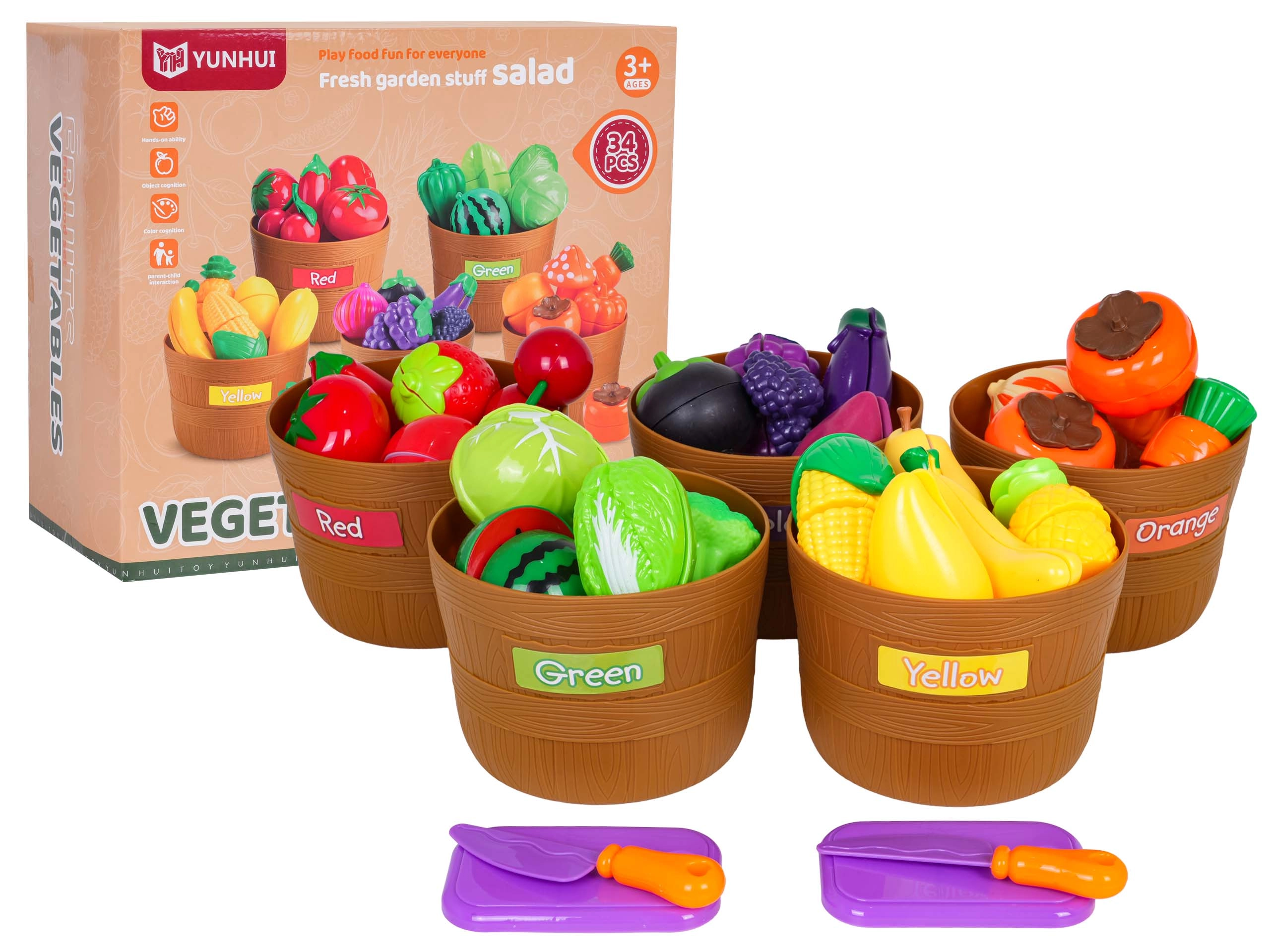 Dette farverige sæt er ideelt til små kokke. Børn kan fordele frugter og grøntsager i farvemarkerede kurve (gul, lilla, orange, grøn, rød) og takket være velcrosamlinger “skære” dem sikkert på de medfølgende skærebrætter. Den solide udførelse i kvalitetsplast tåler daglig leg.