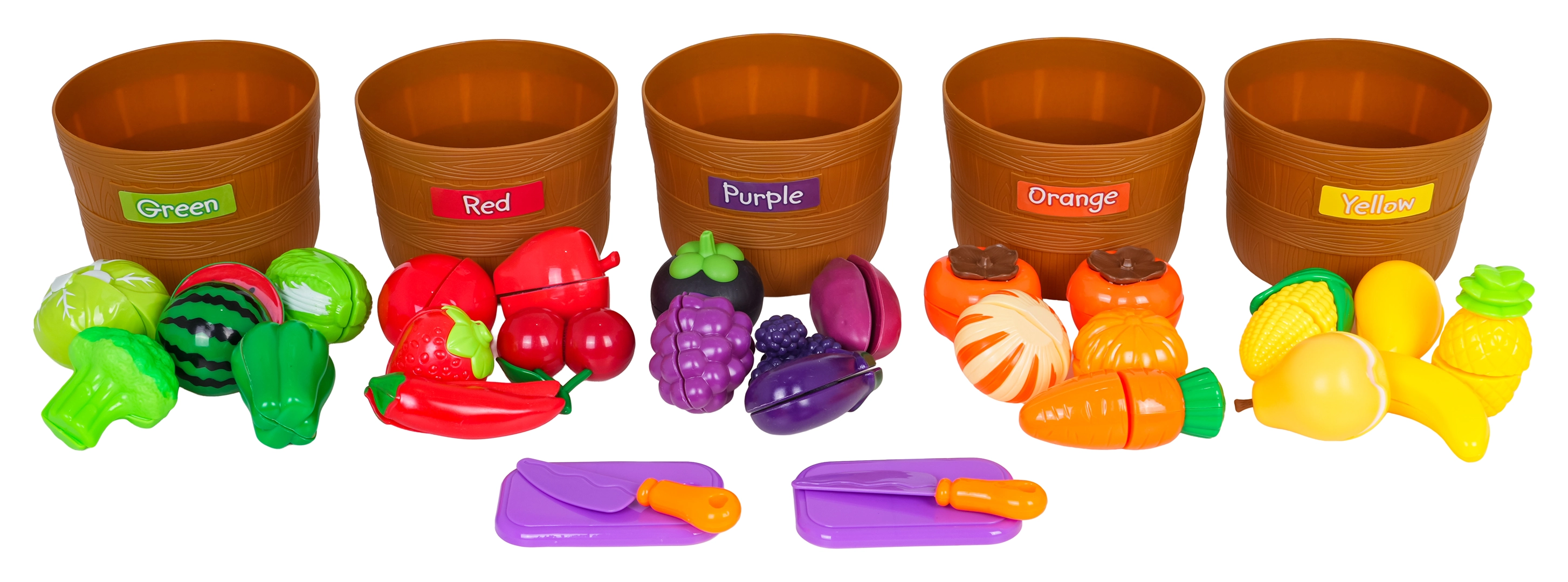 Fem markerede kurve (grøn, rød, lilla, orange, gul) hjælper børn med nemt at sortere frugter og grøntsager efter farve og udvikler logisk tænkning.