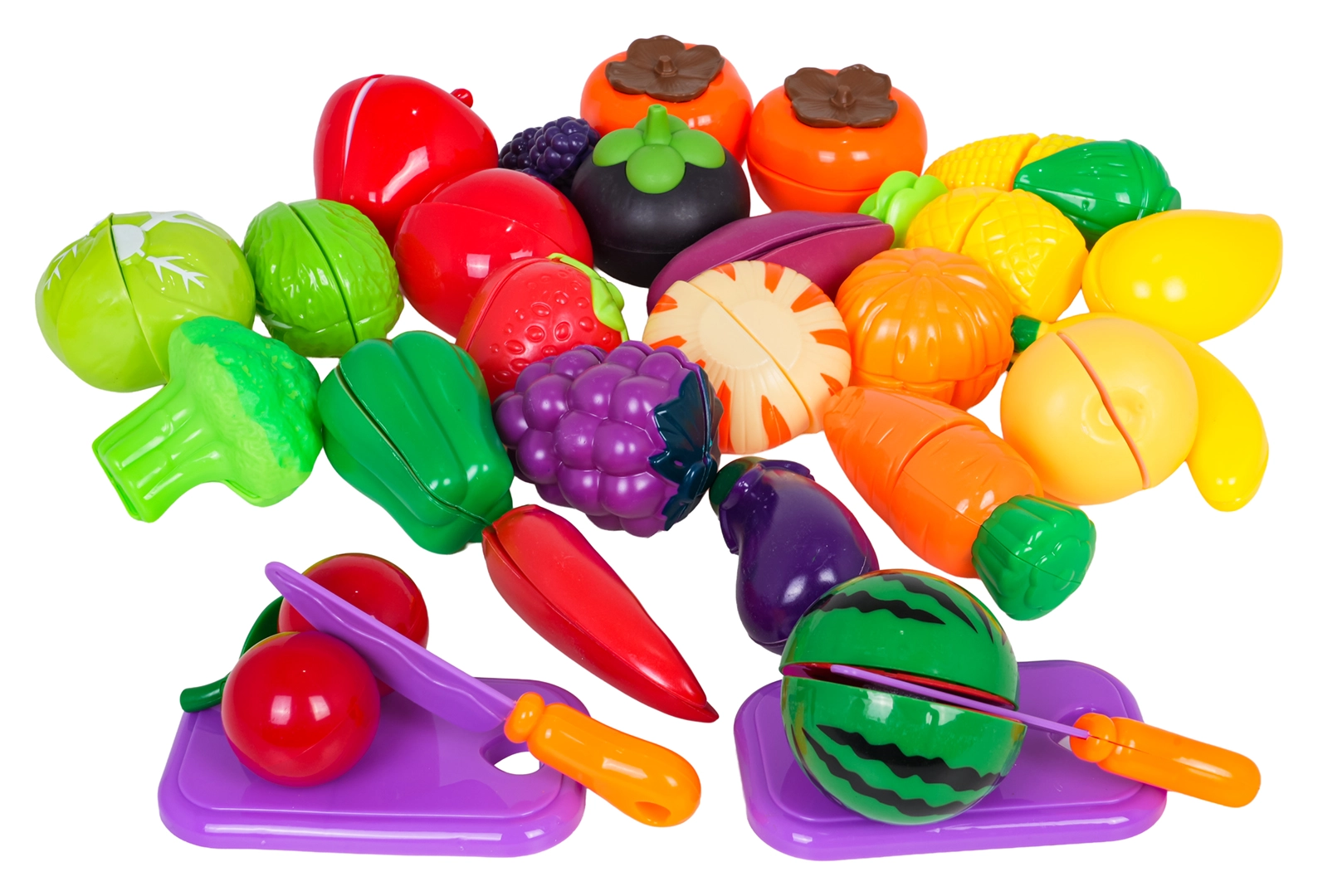 Mange frugter er samlet med velcro – børn kan gentagne gange “skære” dem med de medfølgende plastknive på skærebrætterne uden risiko for skade.
