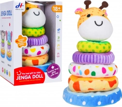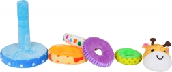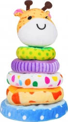 Den søde, bløde pyramide formet som en giraf udvikler finmotorik, hånd-øje-koordination og træner sortering efter størrelse. De farverige, bløde ringe af plys indbyder til berøring og sikker leg. I giraffens hoved er der en pivelyd, som giver lyd ved tryk og stimulerer sanserne. Ideel legetøj til børn fra 18 måneder.