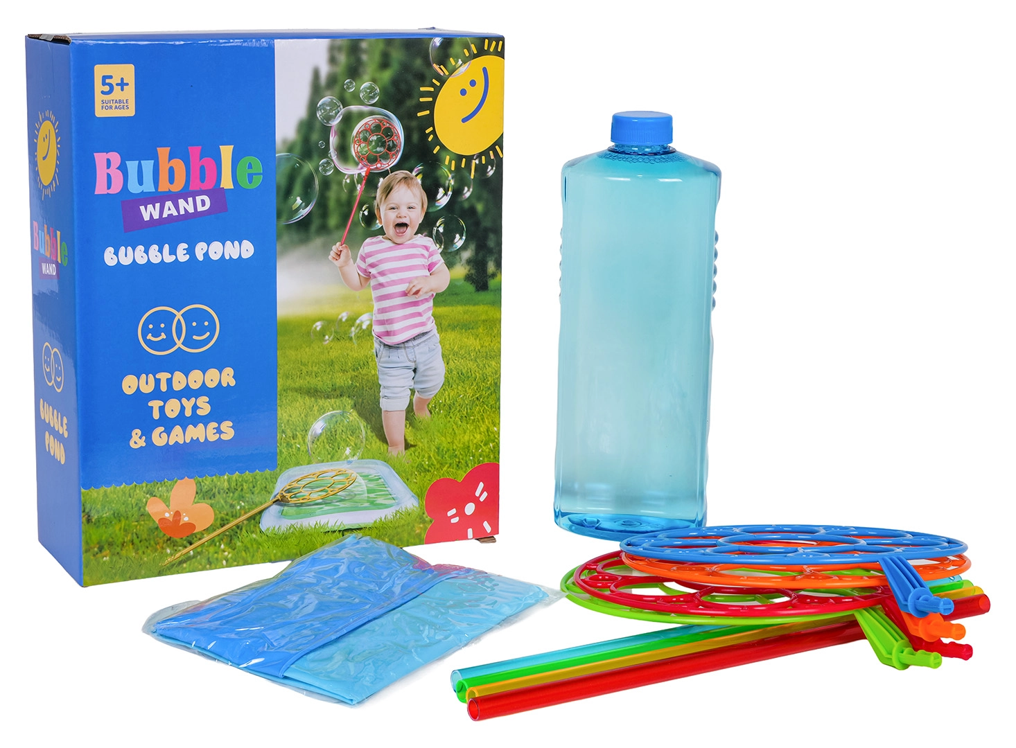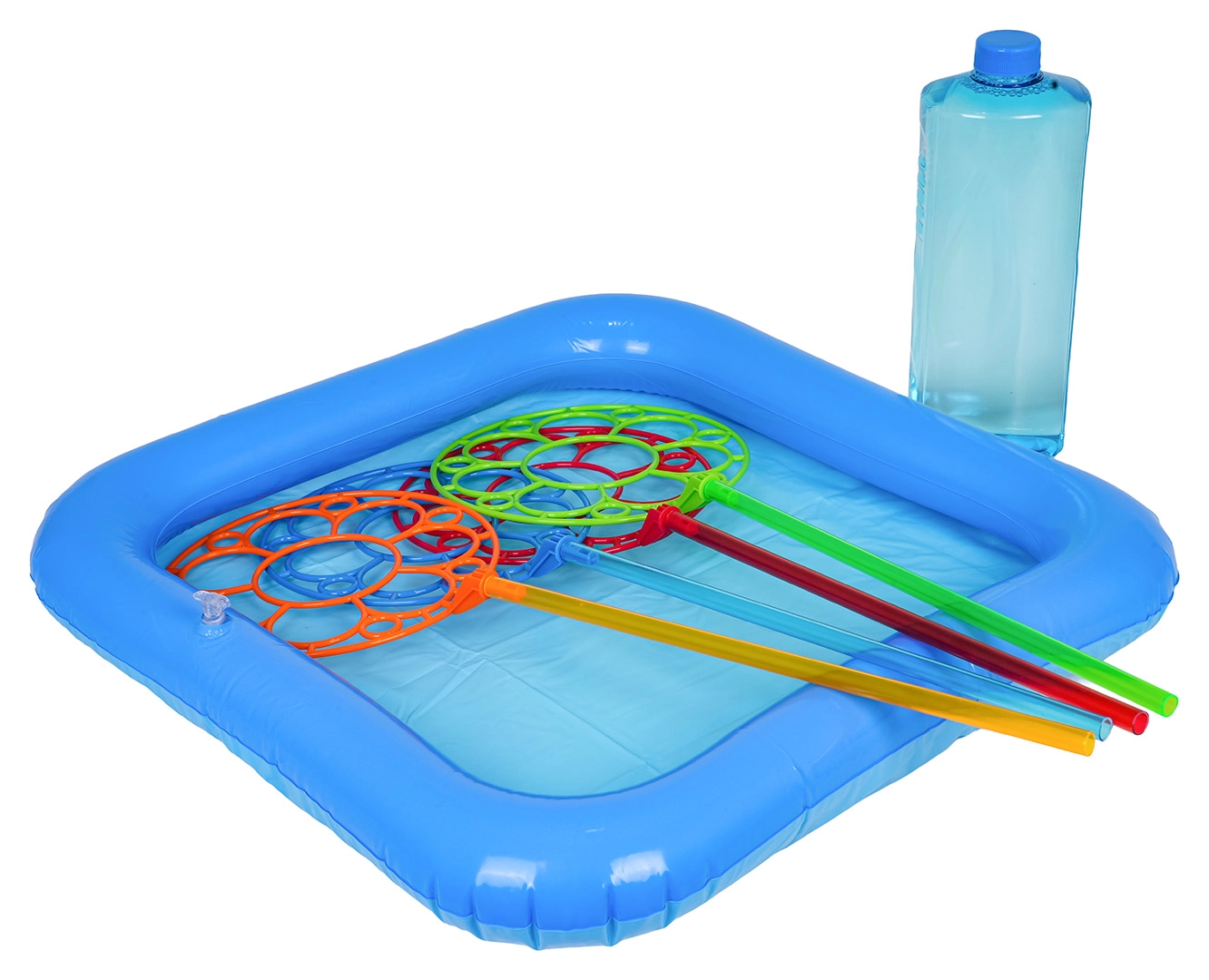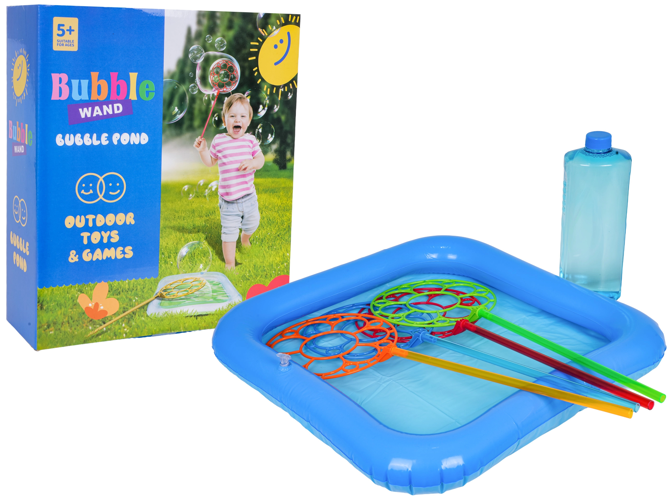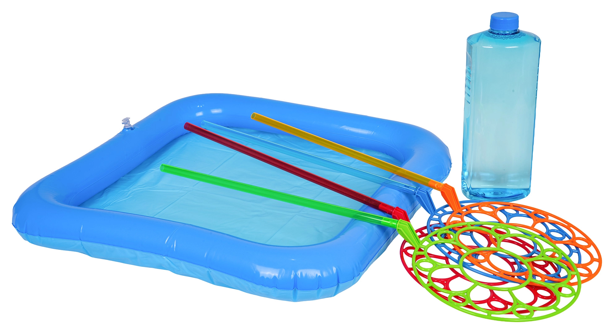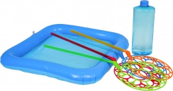 Med dette sæt kan børn nemt lave gigantiske sæbebobler. Hæld blot opløsningen i det oppustelige bassin, dyp en af ringene og pust – så er der garanti for smil og glæde. Ideelt til familiebegivenheder og leg med venner i den friske luft.