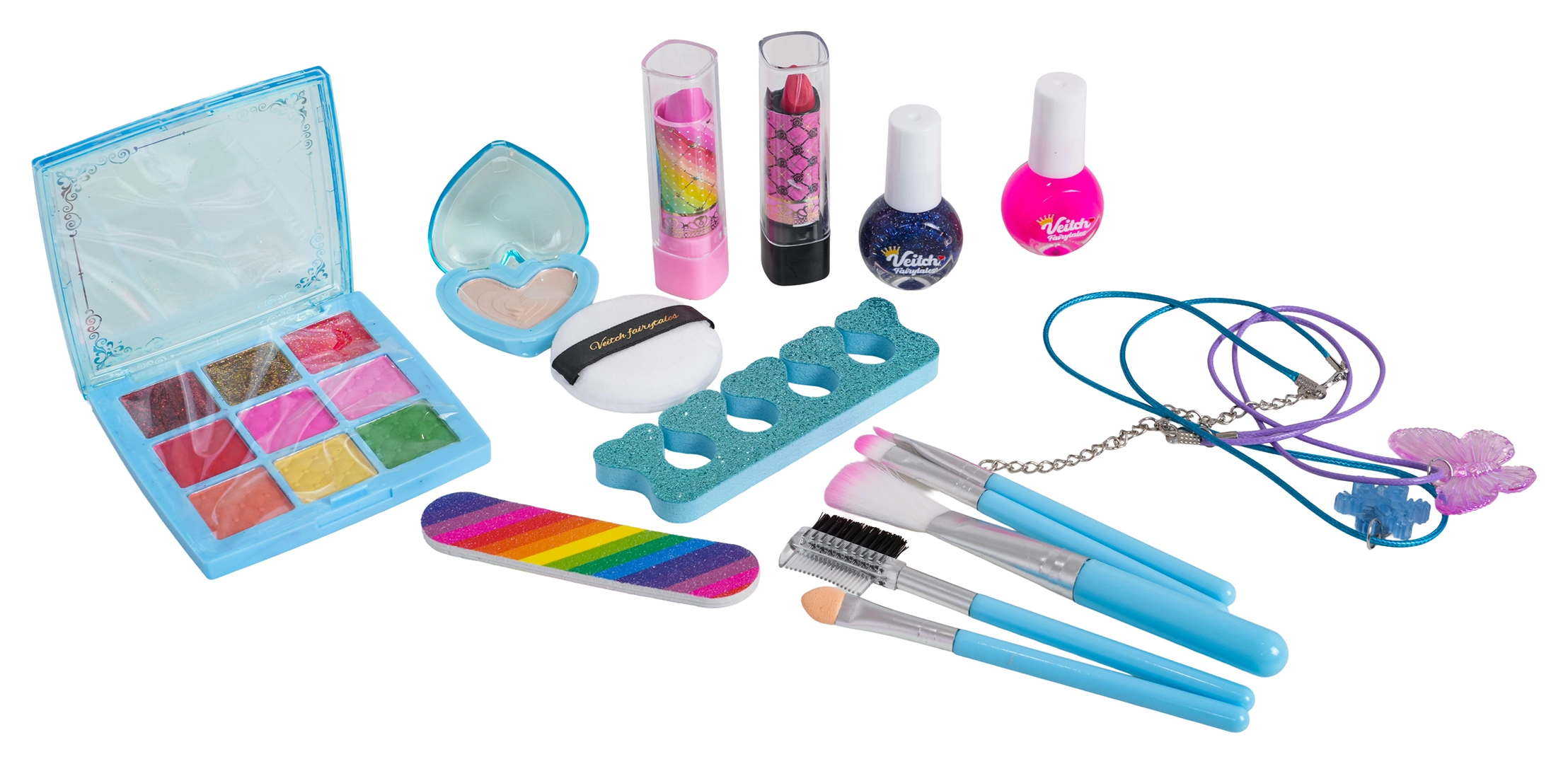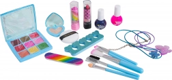 Øjenskyggepalette, lipgloss, læbestifter, neglelakker, pensler, fil og tåseparator – alt samlet i ét praktisk sæt.