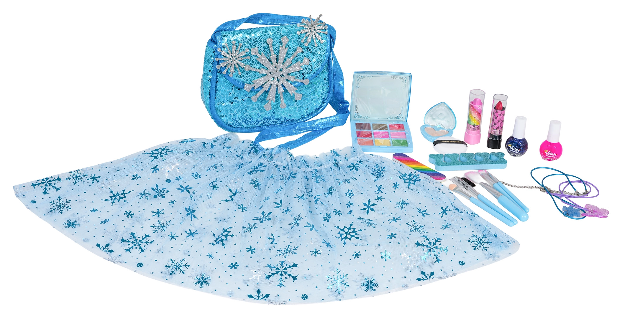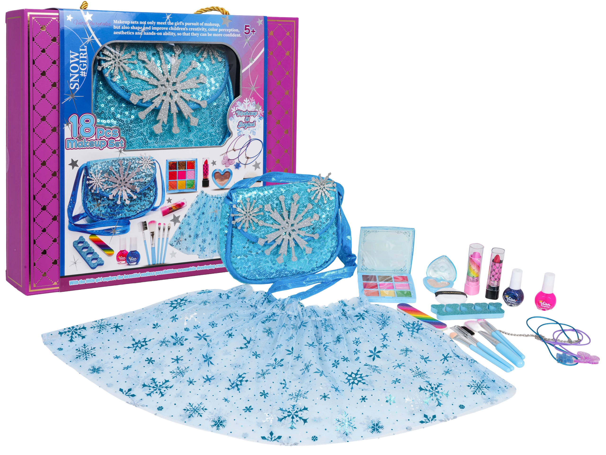 Sættet indeholder et tredelt tylskørt med snefnug, en elegant skuldertaske og en praktisk kosmetikpalette, lakker, glosser, små pensler samt tilbehør til hår og negle. Alt leveres i en gaveæske med hank – perfekt som gave.