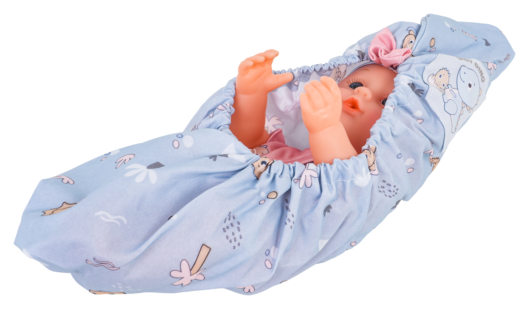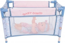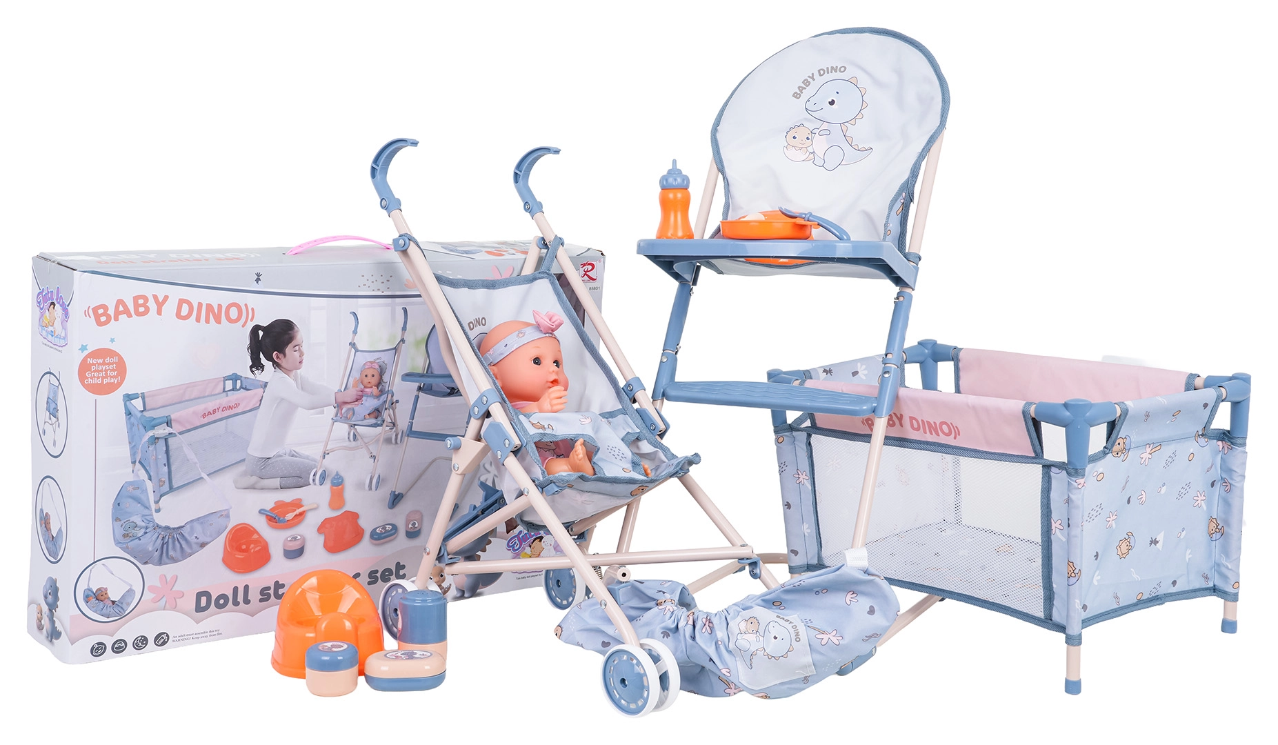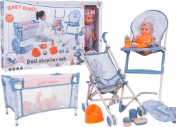 Dette mega BABY DINO-sæt giver børn masser af muligheder for kreativ og realistisk rolleleg med pleje. Dukken har bevægelige arme og ben, er klædt i farverige sparkedragter med hårbånd og kan drikke af flasken og “tisse” på potten. Med den lette klapvogn, rejsesengen og den høje stol kan børnene fodre, køre og putte dukken.