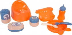 - dukke, rejseseng, klapvogn, høj stol, bæresele, potte, tallerken, ske, gaffel, flaske, krukke til creme, krukke til pudder, sæbeskål, hagesmæk