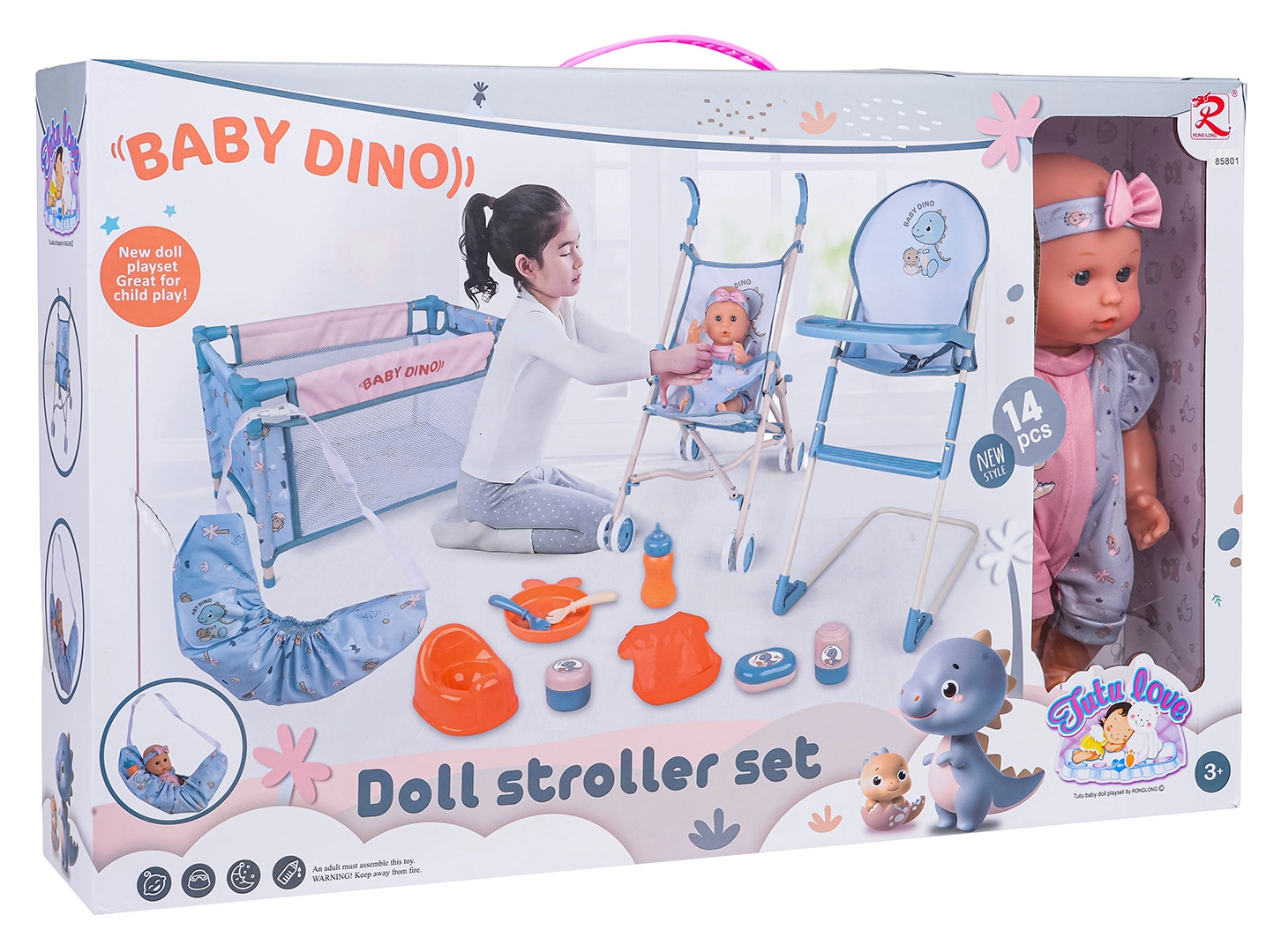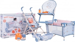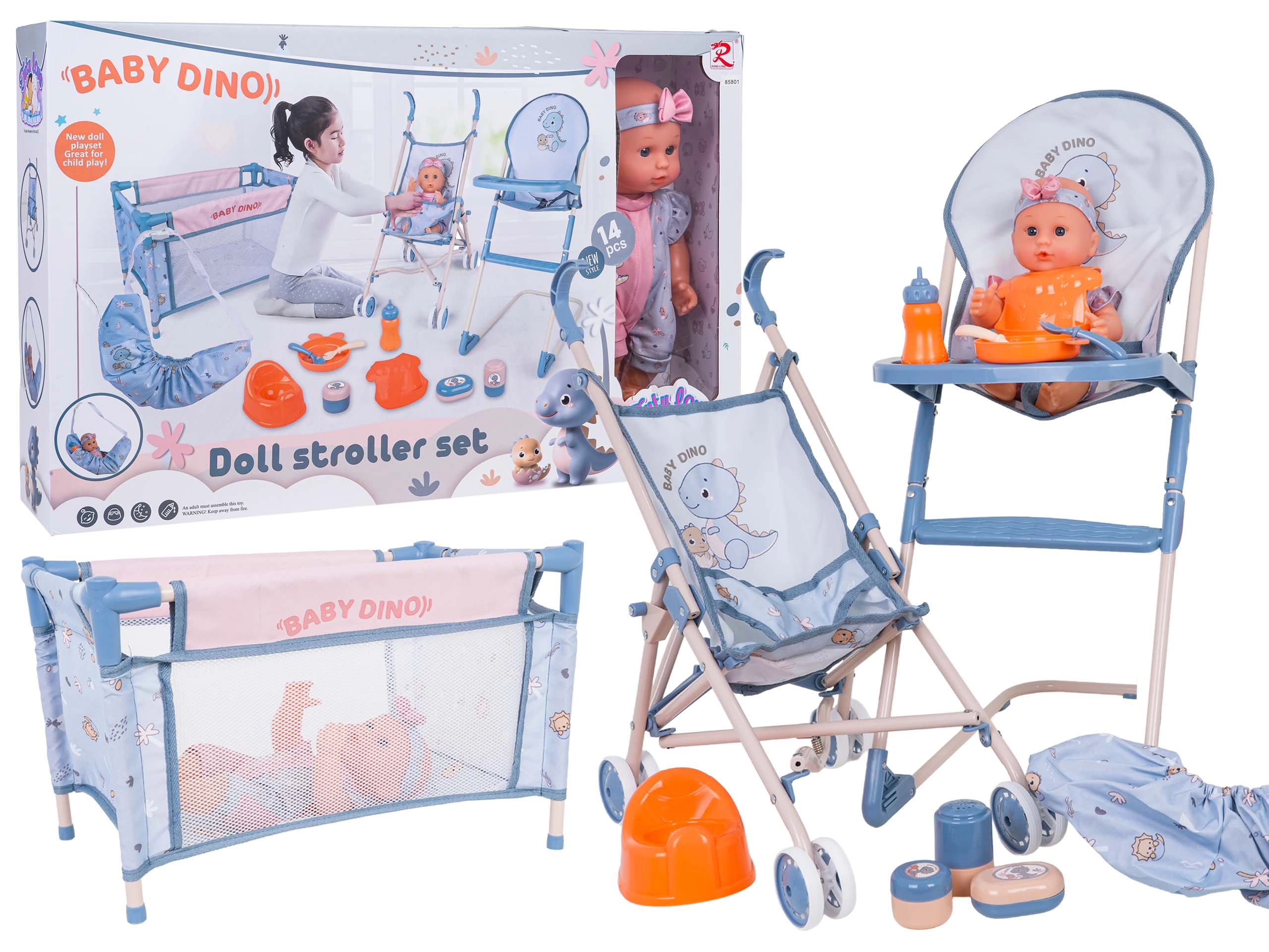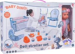Opdag et rigt udstyret mor-og-barn legesæt med den søde BABY DINO-dukke og 14 dele tilbehør. Sættet indeholder klapvogn, høj stol, rejseseng, potte, flaske samt fodertilbehør. Takket være sikre materialer, livlige farver og muligheden for at give dukken drikke og øve potte er sættet ideelt til børn fra 3 år.