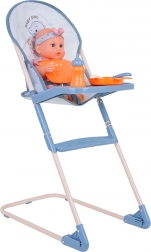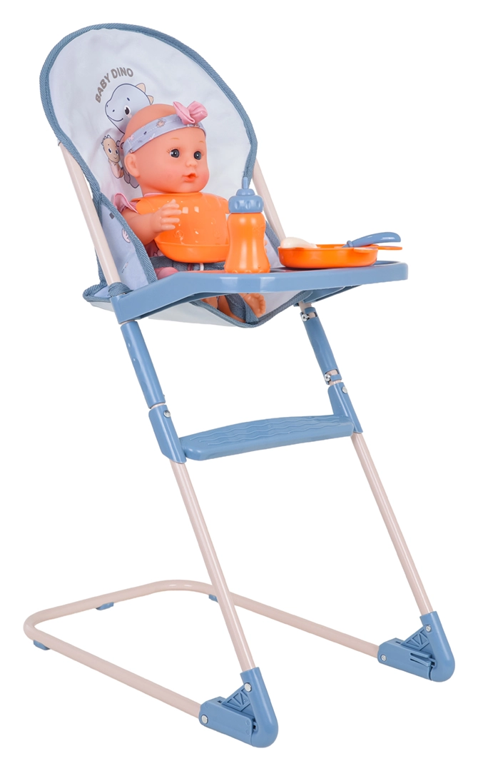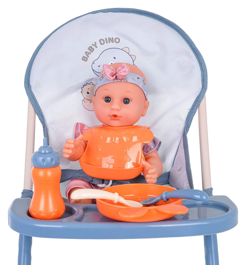 Behagelig fodring af dukken takket være den høje stol med aftagelig bakke og et sæt bestik, tallerken, hagesmæk og flaske. Ideel til realistiske plejescenarier.