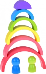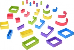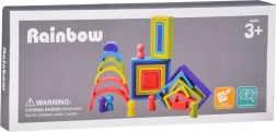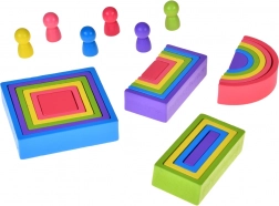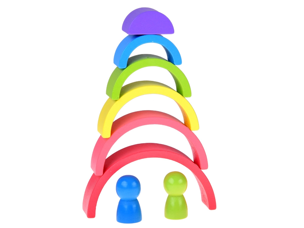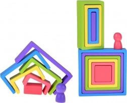 Denne farverige træsæt bringer åben leg inspireret af Montessori-metoden. Børn kan bygge tårne, broer, huse og abstrakte konstruktioner, sortere dele efter størrelse og farver eller indsætte og stable dem i hinanden. Legen udvikler kreativitet, rumlig forestillingsevne og logisk tænkning.