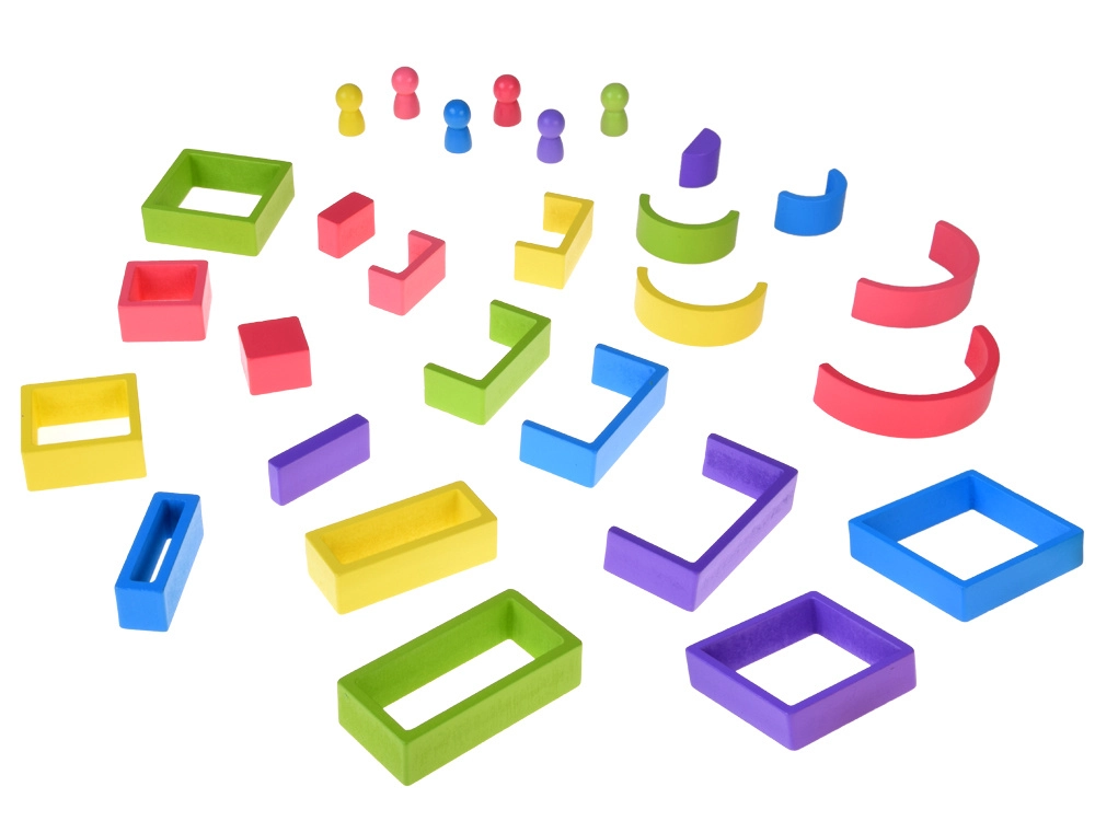 Buer, rammer, broer og andre former kan stables, nestes og balanceres. Børn træner finmotorik, og læringen sker naturligt gennem leg.