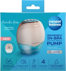 CANPOL babies Hands‑Free er en trådløs elektrisk brystpumpe designet til aktive mødre. Takket være det kompakte design passer den i BH’en, arbejder støjsvagt (maks. 50 dB) og giver bevægelsesfrihed derhjemme, på arbejde og på farten. Tre tilstande efterligner barnets naturlige sutterytme, og i hver kan du vælge 8 intensitetsniveauer op til 26 kPa for maksimal komfort.