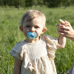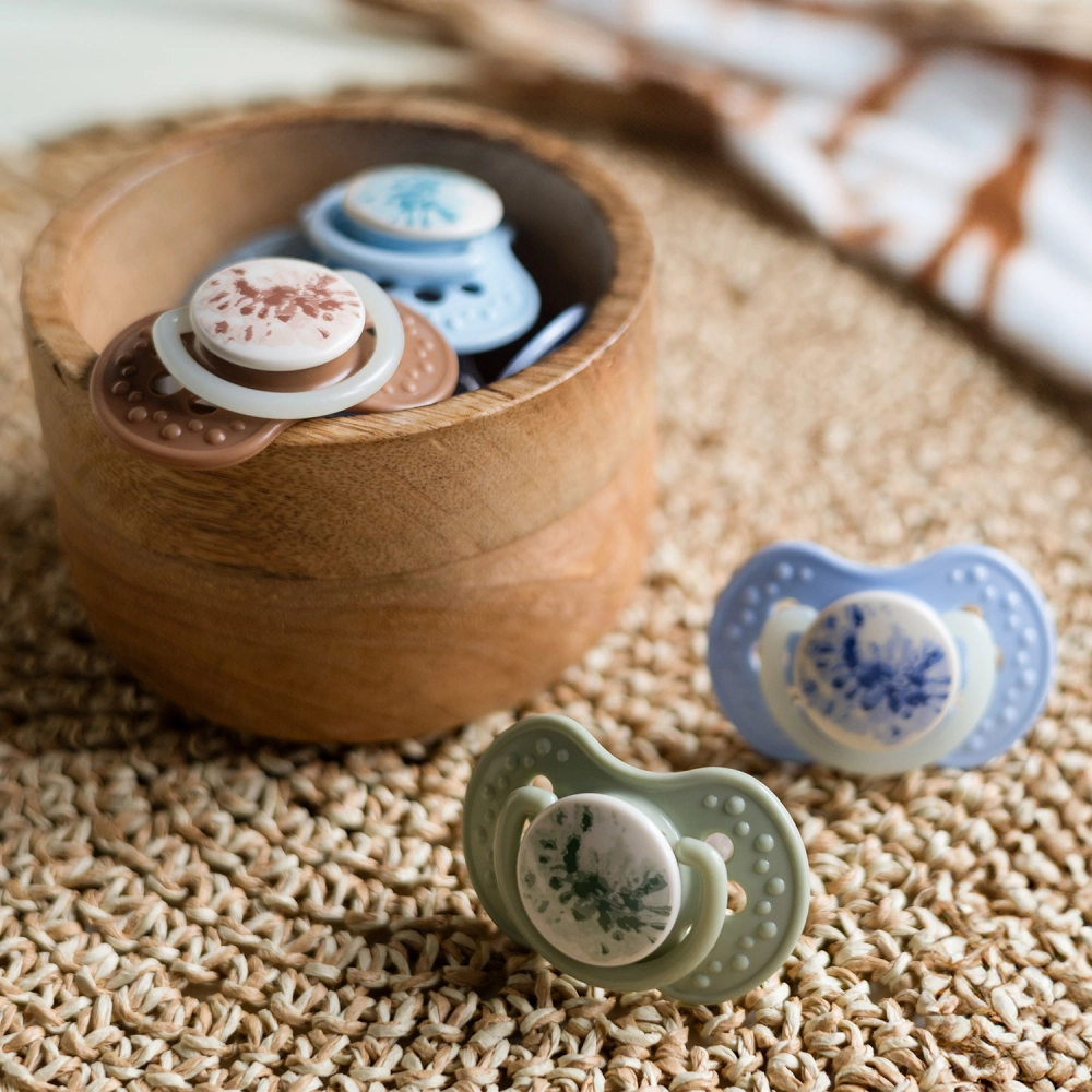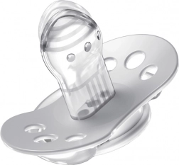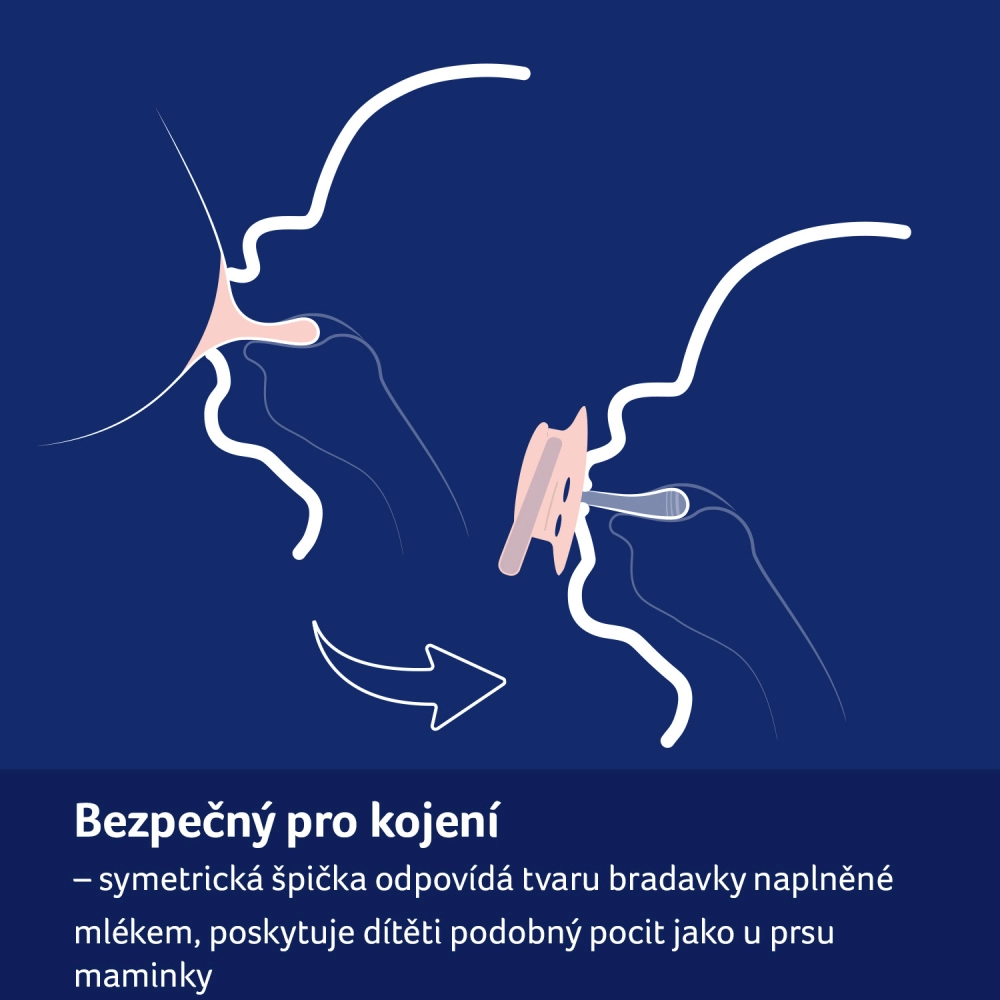Homogen silikone trækker sig rytmisk sammen og udvider sig under sutten. Den fladtrykte, symmetriske form understøtter korrekt tungemotorik og fri lukning af munden.